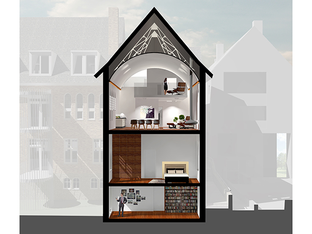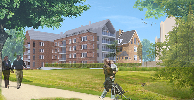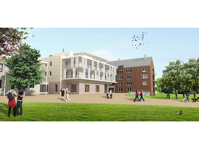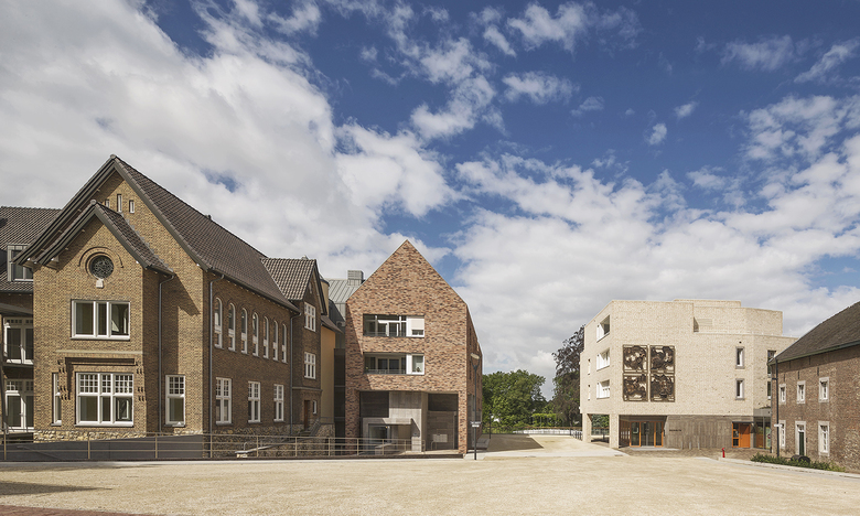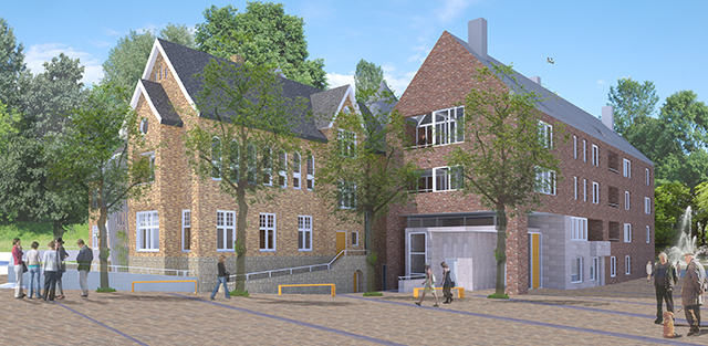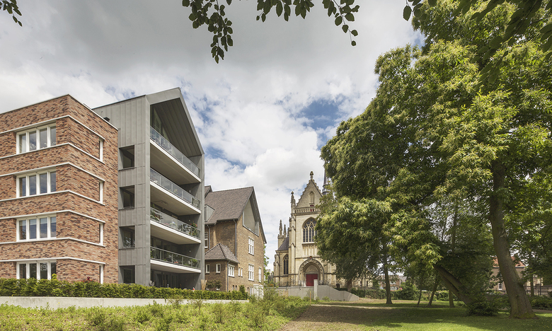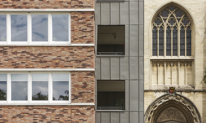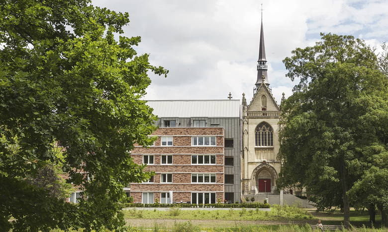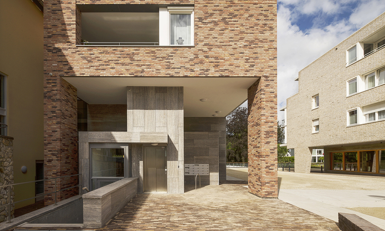 Maison Proosdij consists of three building volumes, which are connected to one another via a central hall. The entrance to the complex is located on the side of the enlarged market square, where also the public access to the underground parking is located at a prominent porch. The contours of the new building elements are oriented with respect to shape, profile and volume of the monastery, but speak in terms of architecture and materiality of each block a distinctive, own language. In the existing, partially demolished monastry two multi-storey townhouses are realized, one of which in the former chapel. The facades of the monastery are restored and only where necessary, adapted to the requirements of the new use. In the new wing 19 apartments are implemented on four levels, which are either geared to the park or to the market square. The entire complex keeps the memory of the old, in the cityscape of Meerssen charakteristik monastery alive, but at the same time due to the additions the ensemble creates a new significant character for the place between the monumental basilica and the beautiful park with historic trees. The expanded marketplace, framed by the construction of the Maison de Ville and the Maison Prosdij will make an important contribution to the new perception of the public space in the heart of Meerssen.