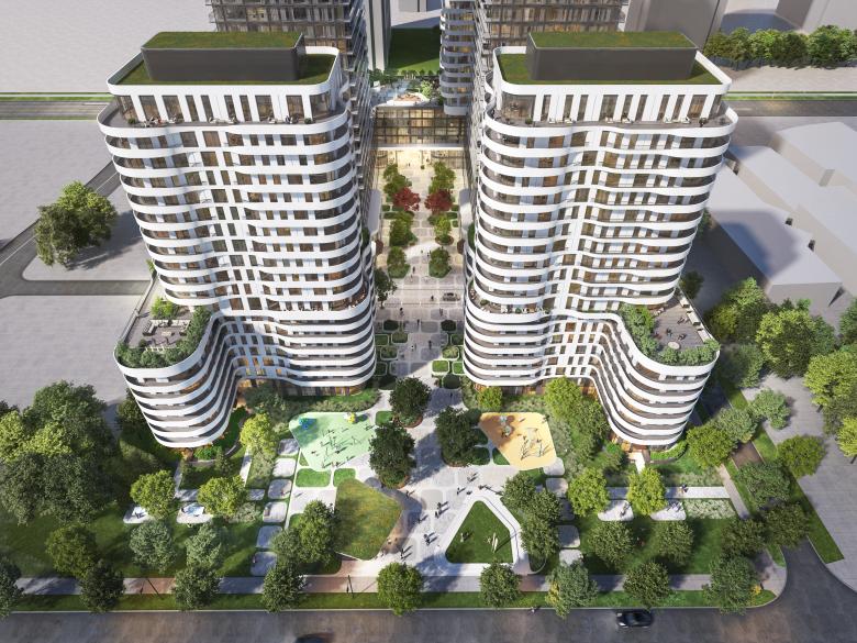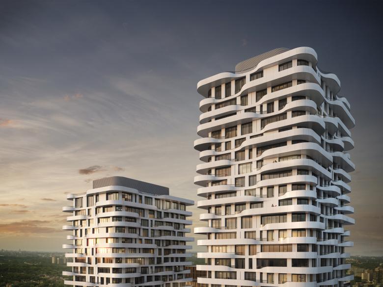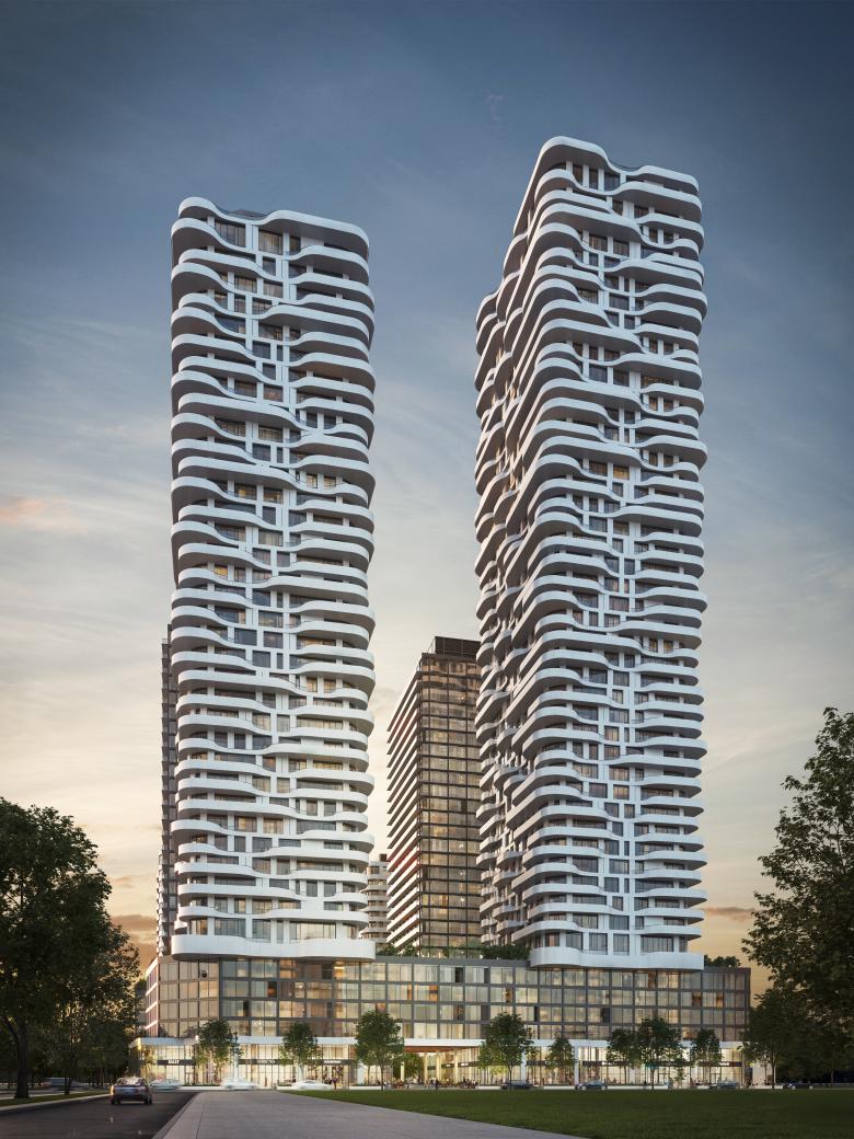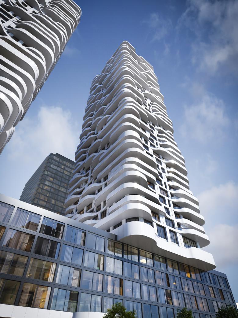 These towers are wrapped with architecturally distinctive strips of balcony. These curvilinear balcony-ribbons soften the profile of the towers, creating an organic sculptural presence in place of the typical boxiness of towers. The design intention is to introduce a level of architectural sophistication that enhances the status of this emerging neighbourhood.