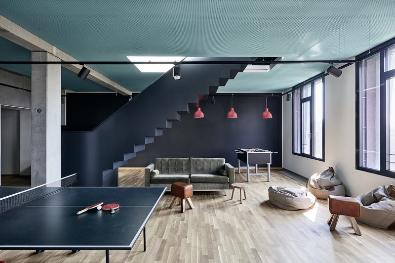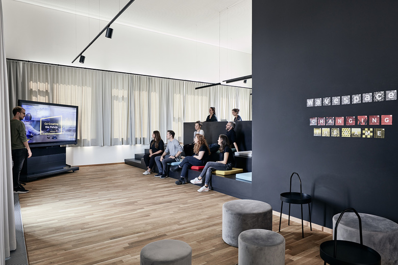 Die Anforderungen an die ca. 3.500 qm große Bürofläche bestand aus der Schaffung einer fließenden Raumkonfiguration für variable Teamgestaltungen und wechselnde Atmosphären. Die neuen Räume verstehen sich daher eher als innovatives Labor denn als klassische Büroräume. Dieser Grundgedanke wird durch das flexible Möblierungskonzept auf beiden Geschossen, das eine multifunktionale Nutzung zulässt, unterstützt.