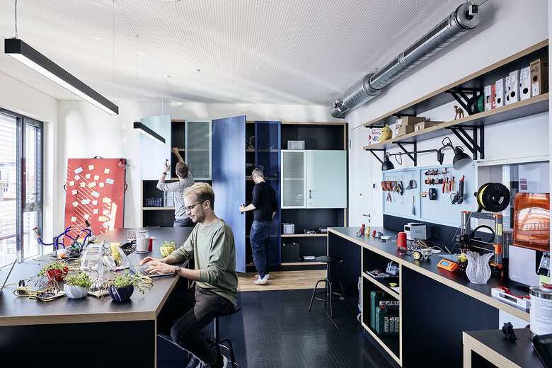 Das angrenzende, buchbare Prototyping Lab im 5.OG wurde als aktiver Werkstattbereich konzipiert, dessen Ensemble aus maßgefertigter Werkbank, Workbench und Materialschrank die Nutzung des Raums unterstützt. Der kreative Raum ist mit den entsprechenden Hard- und Software-Anlagen für Prototyping ausgestattet und bietet Platz für das Entwickeln der Produkte.