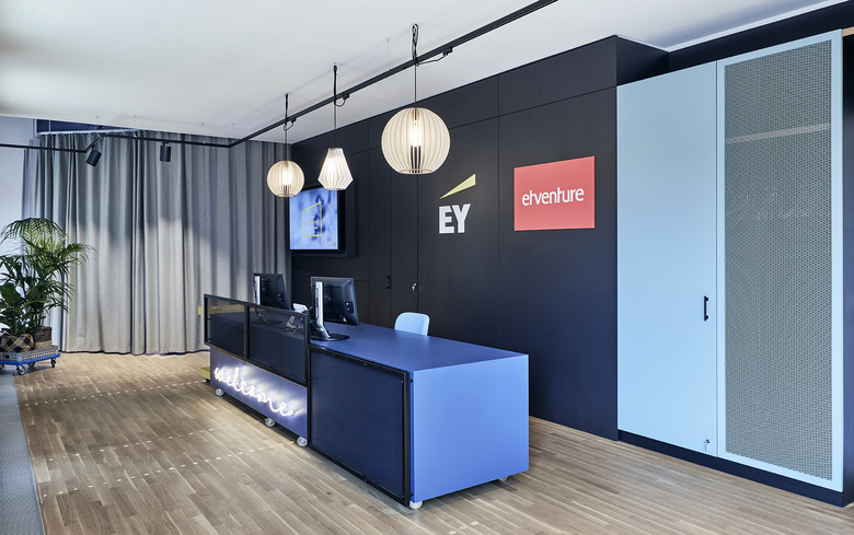 Herzstück der Fläche im 5. OG ist der ca. 250 qm große volltechnologisch ausgestattete Wave Space. Er vereint die Aktivitäten und Player mit dem Ökosystem des Startups und reflektiert die Wave Space Marke. Er dient als Ort, wo die Innovationen, die in Zusammenarbeit mit EY und Etventure entstehen, mit den Kunden entwickelt und ausgeführt werden. Ausstattung und Technik sind so konzipiert, dass der Raum für Events unterschiedlicher Größen multifunktional genutzt werden kann. Bei größeren Veranstaltungen lässt sich der vorgelagerte Empfangsbereich flexibel hinzuschalten. Die Gestaltung mit textilen Raumteilern und modularer Möblierung in industriellem Stil sowie die offene Deckengestaltung mit freiem Blick auf die offene Technik unterstreicht den klaren Event-Charakter des Raums.