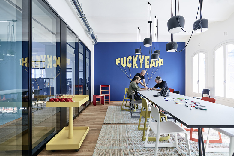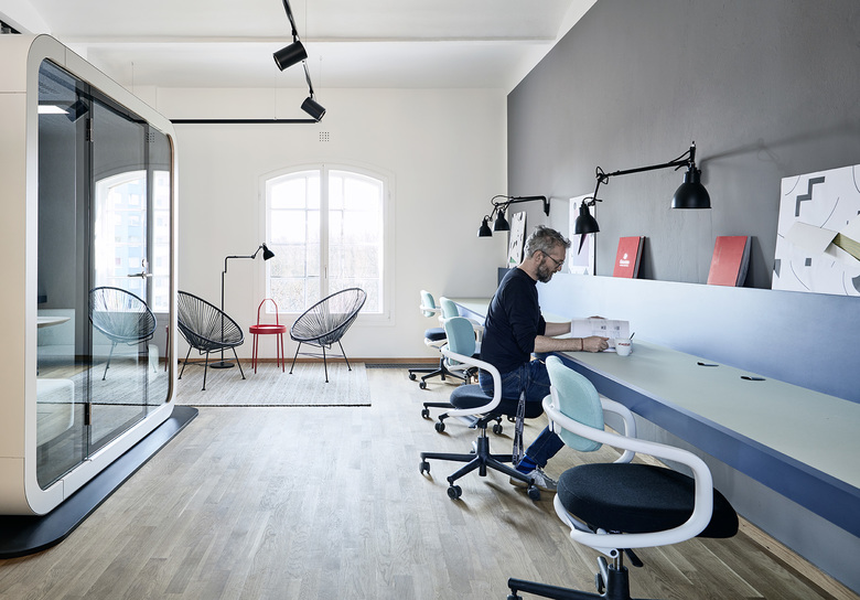Zur Förderung agiler Arbeitsmethoden sind die Projekträume mit maßgefertigten Arbeitstischen ausgestattet, deren Tischplatten auch als White- und Pinboard fungieren. Wandmontierte Workbenches für temporäres Arbeiten sowie Mini Meetings als Rückzugszelle für bis zu zwei Personen stehen den Mitarbeitern auf beiden Geschossen zur Verfügung.