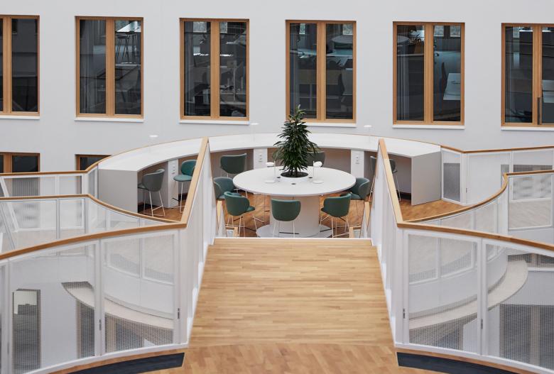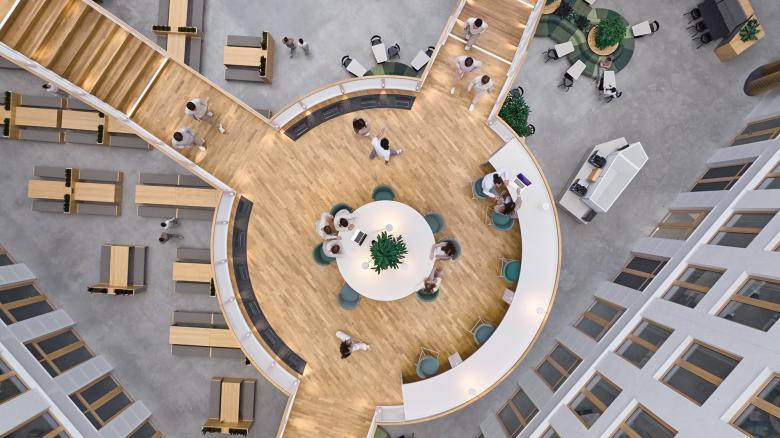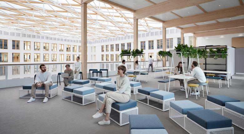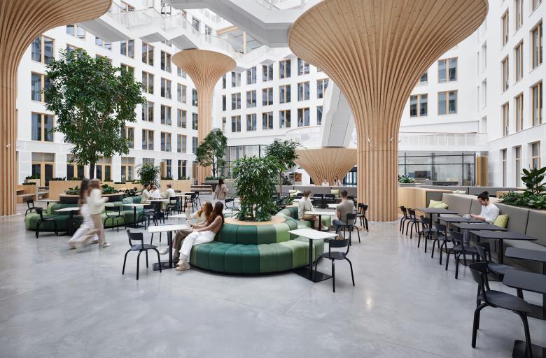 Die Gestaltung und Zonierung des Atriums mit seinen vier baumförmigen Stützen (Trees) war eine der größten Herausforderungen. Der Raum sollte als Restaurant und repräsentative Begegnungsstätte fungieren, zur Bewegung der Mitarbeitenden zwischen den Geschossen einladen, Sitzangebote für ungezwungene Meeting- und Co-Working-Situationen formulieren und zudem als Kommunikationszentrale dienen.