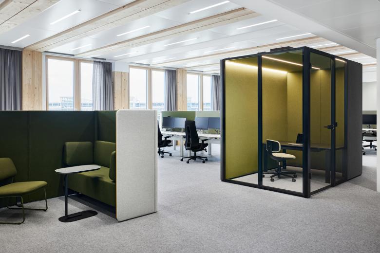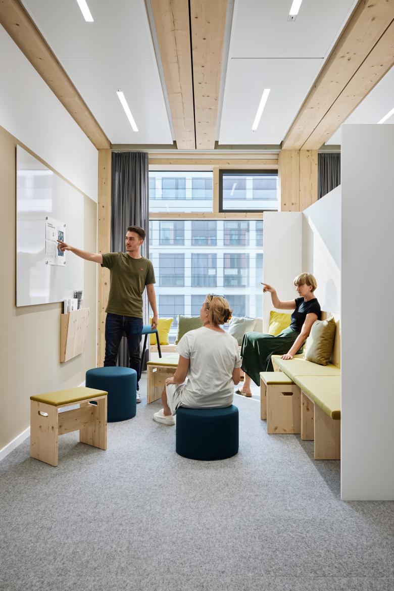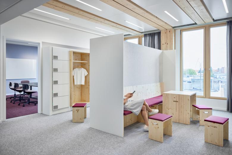 Die Teamareas dienen mit unterschiedlichen Farbgebungen einzelner Zonen zur besseren Orientierung im Gebäude. Jede „Teambase“ – unter den Mitarbeitenden gern auch als „Bushaltestelle“ bezeichnet - wird von den Teams individuell bespielt und steigert so das Identifikationsgefühl. Die Arbeitsplatzbereiche werden kombiniert mit eingestellten Phone Booths und Meetingboxen, Rückzugsbereichen zum Relaxen oder ruhigen Arbeiten, Zonen für Informal Meetings, Stauraumflächen sowie Lockereinheiten.