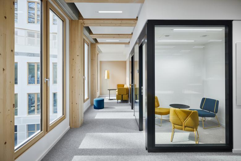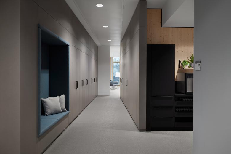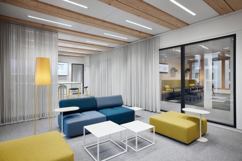 Vom halböffentlichen Raum des Atriums gehen im Erdgeschoss eine separate Konferenzzone mit Coffee Bar sowie eine angrenzende Kreativzone mit Projekträumen ab. Hier stehen vier kleinere Konferenzräume zur Verfügung sowie ein großer teilbarer Konferenzraum, der bei Bedarf zusammengeschaltet werden kann und Platz für bis zu 100 Personen bei Vortragsbestuhlung bietet. Die sechs Projekträume sind für besondere Kreativprozesse gedacht, in denen die Teams zusammenkommen können, um auch mehrtägig gezielt an Lösungen zu arbeiten.