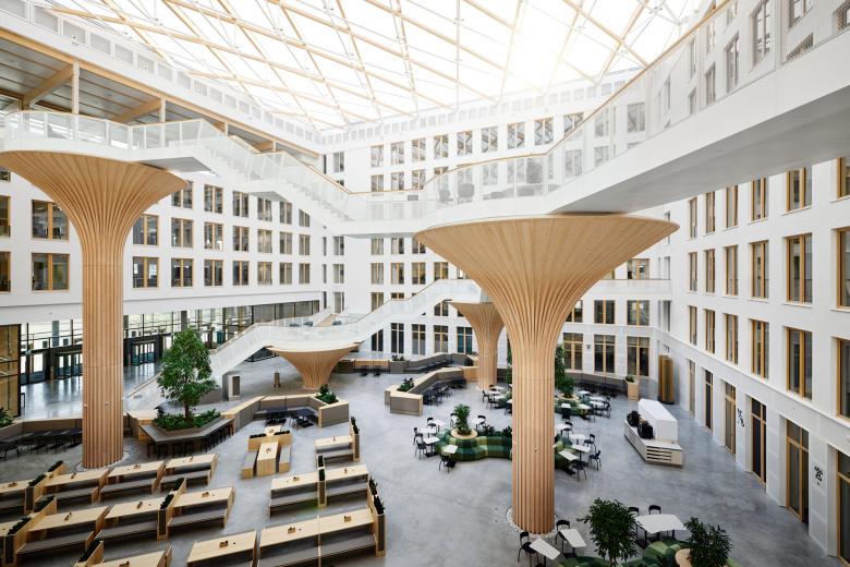 Der Neubau nach den Entwürfen von Tchoban Voss Architekten ist das deutschlandweit größte, fertig gestellte Holz-Hybrid-Bauwerk und erhielt die höchste DGNB-Zertifizierung als nachhaltigstes Gebäude in Deutschland sowie den „DGNB Diamant“ für herausragende gestalterische Qualität der Gesamtkonstruktion und der Innenräume.