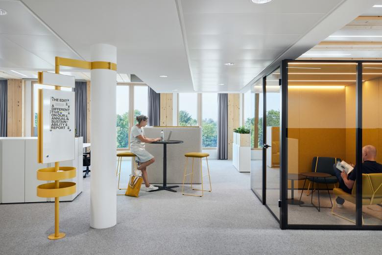 Da es sich im Gesamten um ein non-territoriales Arbeitsplatzkonzept handelt, sind alle Mitarbeitenden frei in der Platzwahl innerhalb des Gebäudes, jedoch ebenso den „Teambases“ zugeordnet. Als Ergänzung befinden sich auf jedem Geschoss zwei zum Atrium gewandte Teamküchen mit Dinerbereich und Coffeebases sowie separate buchbare Collaboration Center.