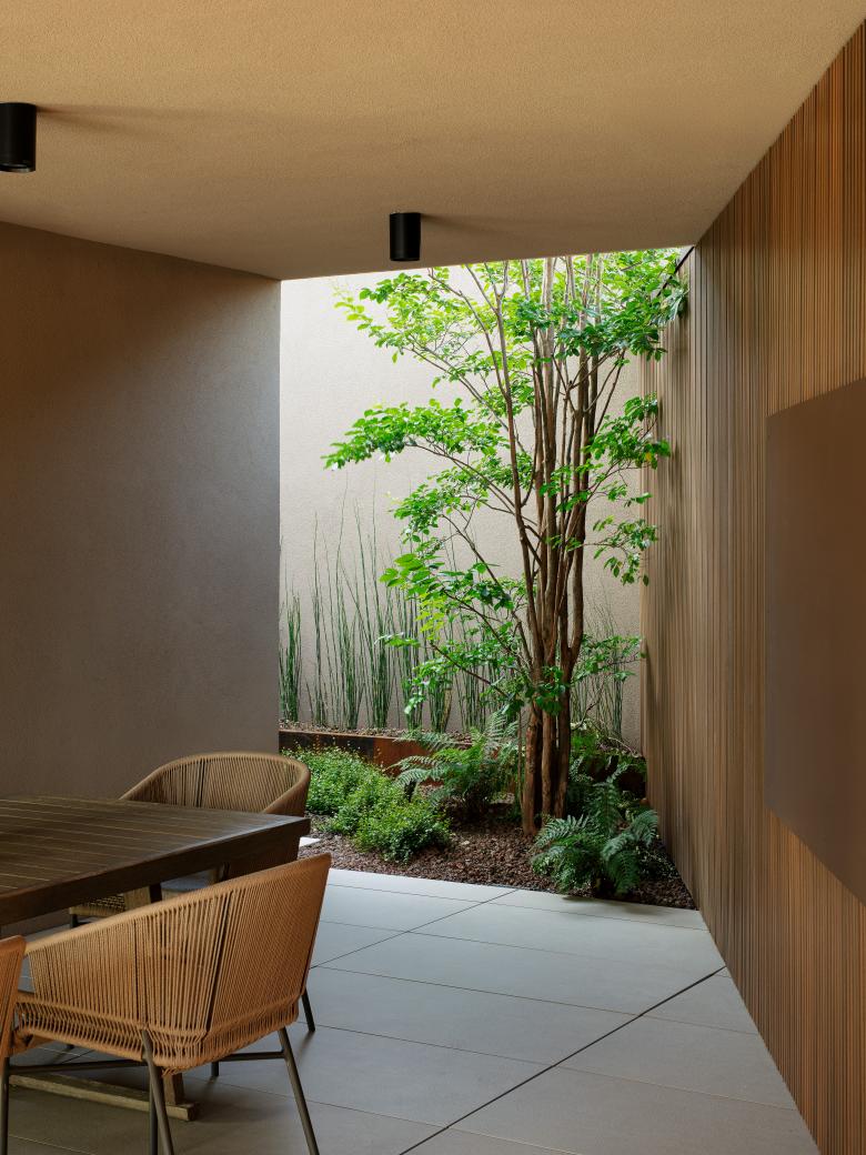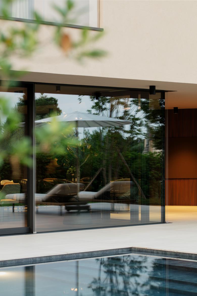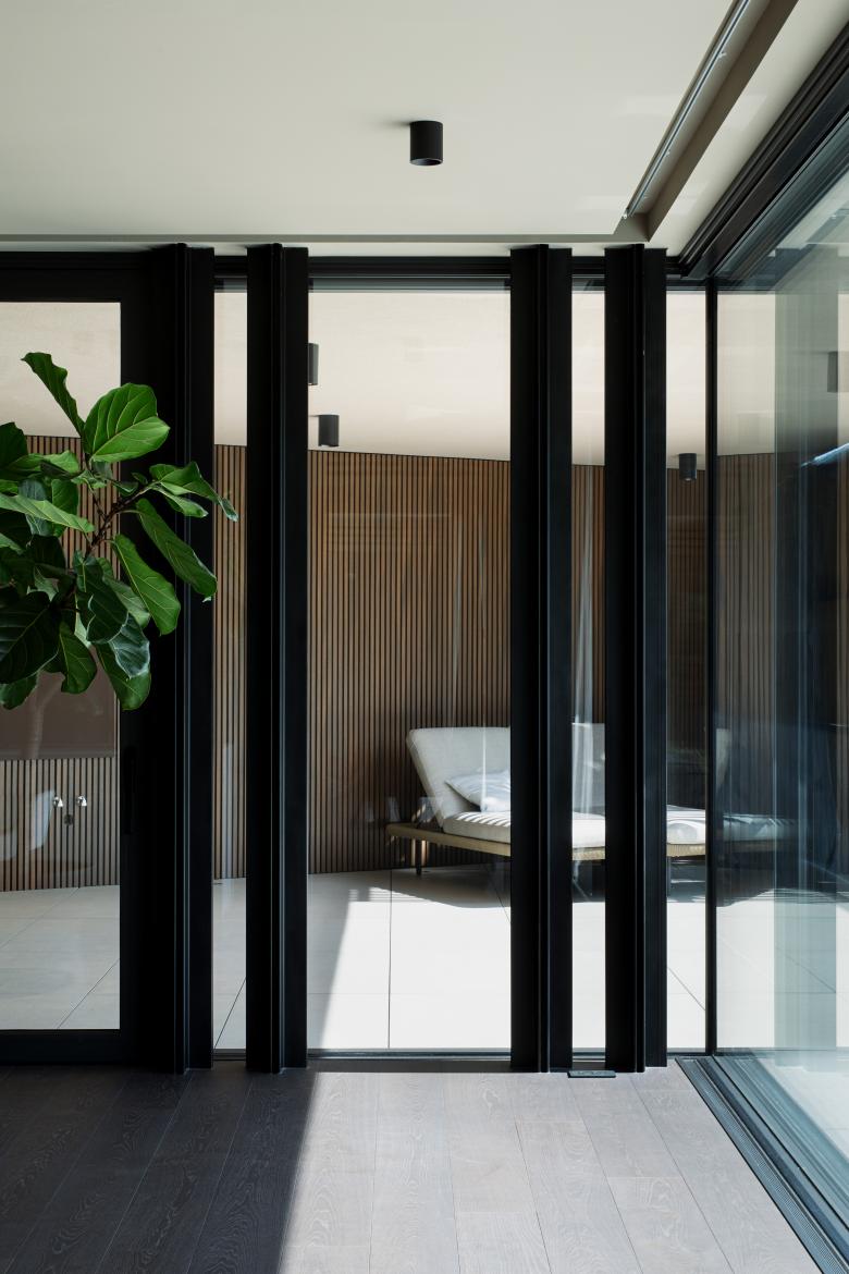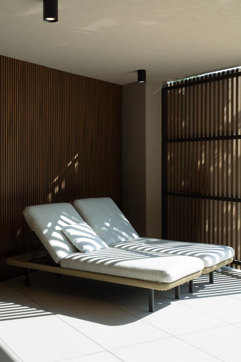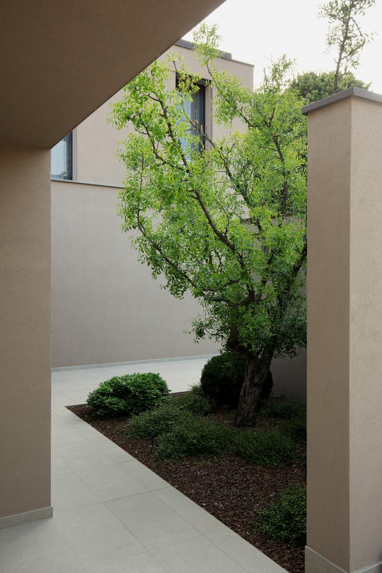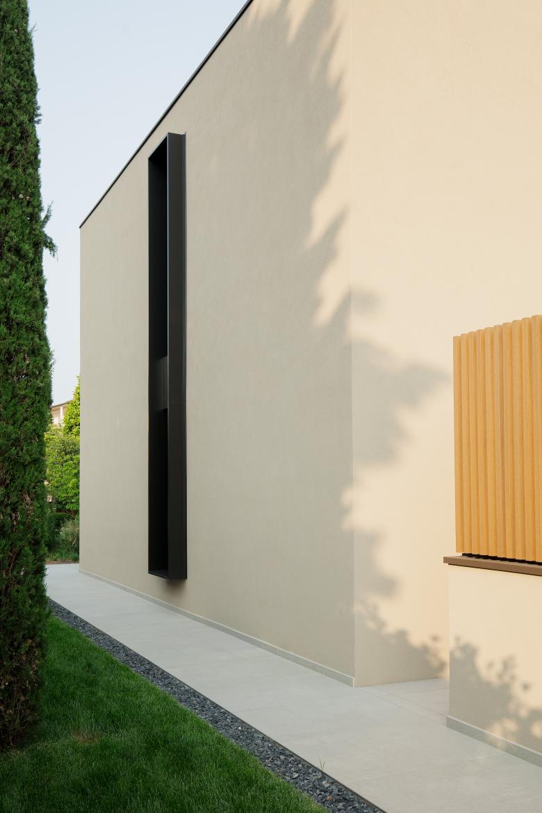 Le aperture, strategicamente posizionate, sono studiate per massimizzare l’ingresso di luce naturale e creare un’atmosfera accogliente. I volumi architettonici si presentano nella loro essenzialità, rivestiti di intonaco color terra, arricchiti da dettagli in metallo nero e inserti in legno che conferiscono calore all’estetica generale. Al primo piano, una terrazza privata è elegantemente schermata da una pelle di doghe verticali in legno, che offre il giusto grado di privacy senza compromettere la luminosità.