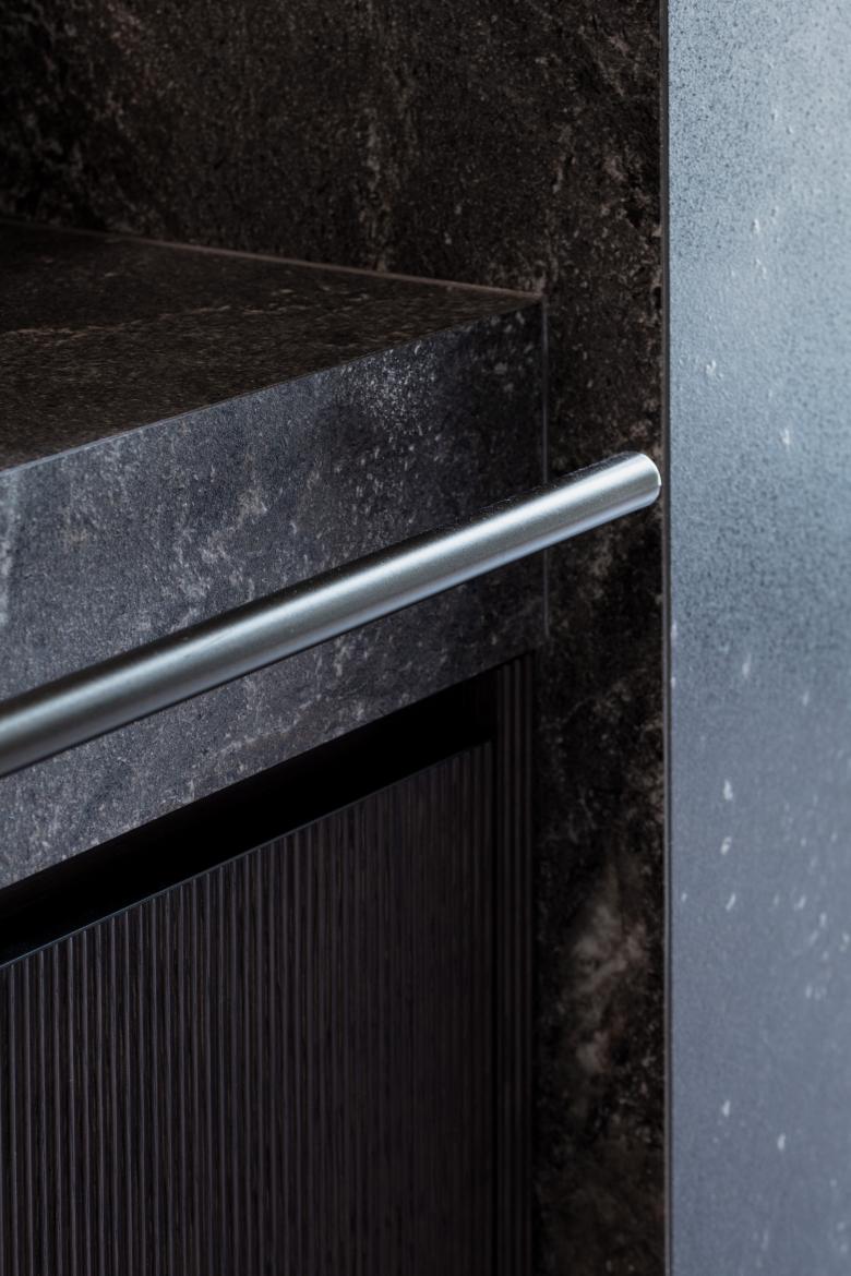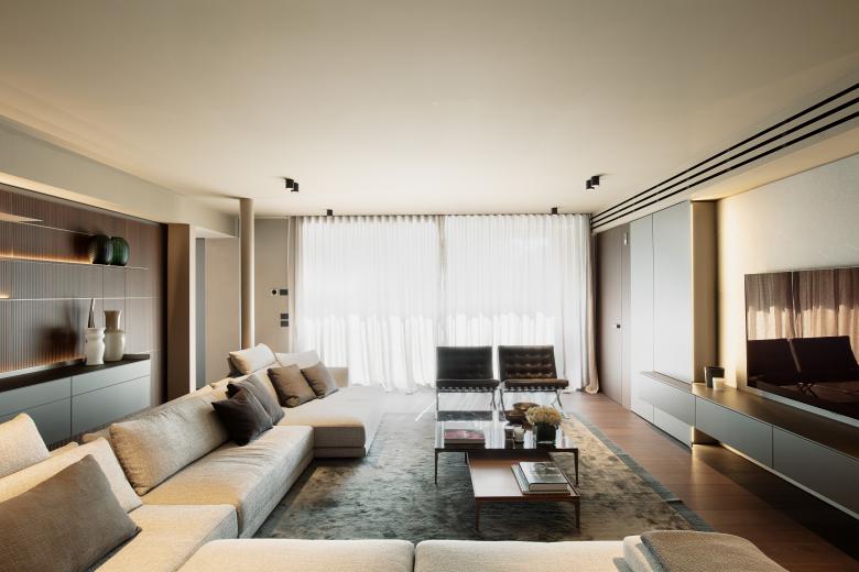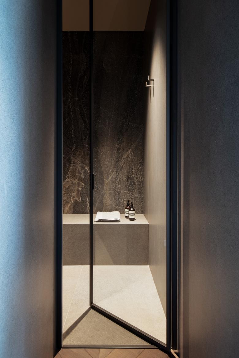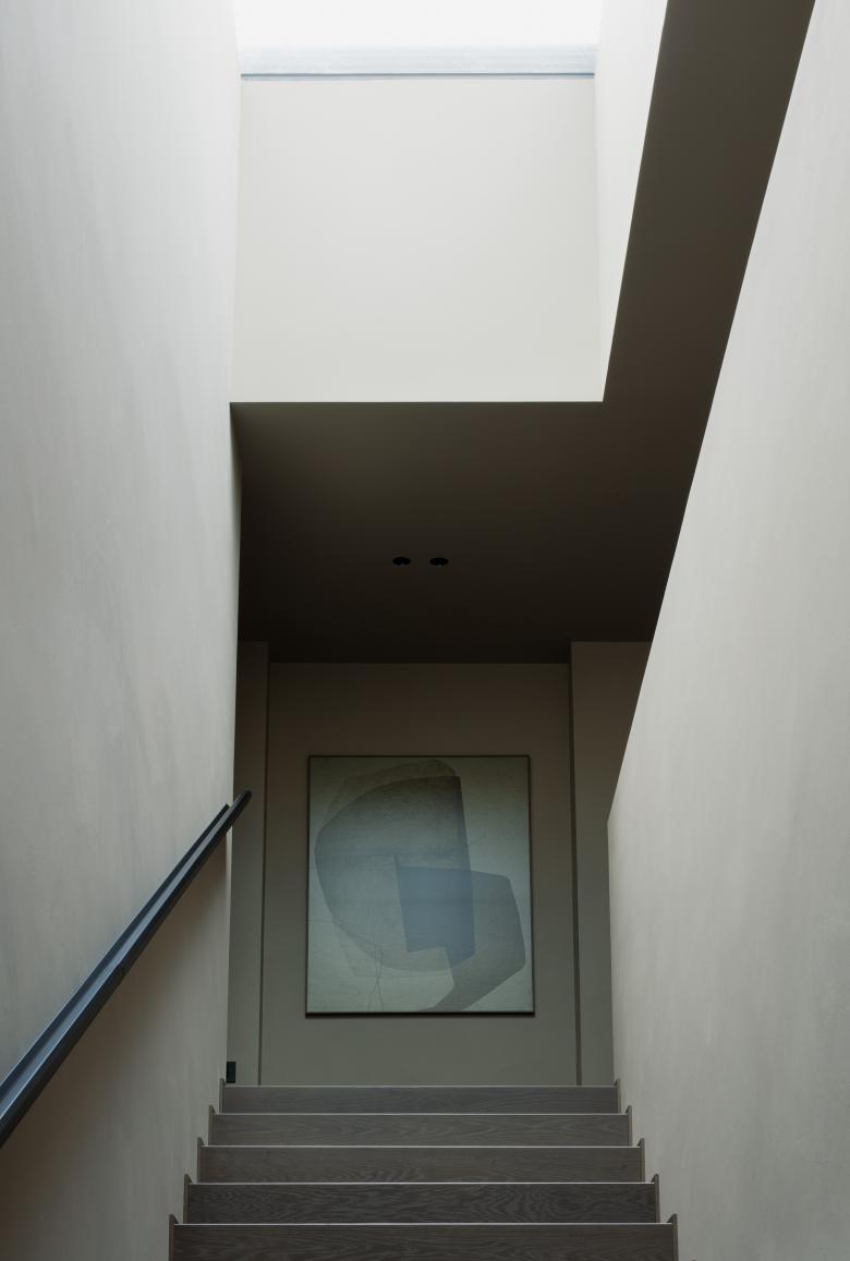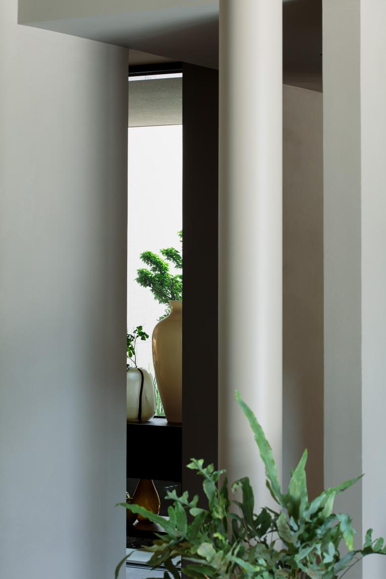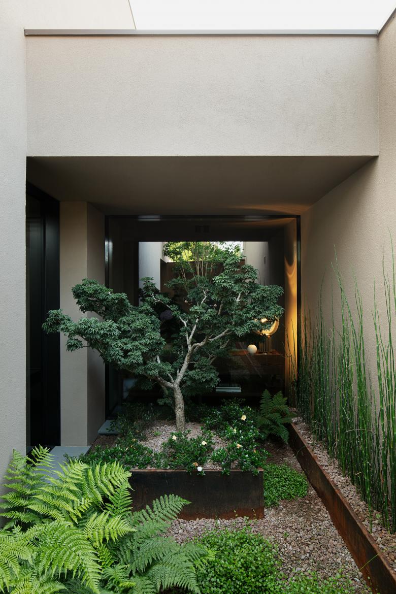 Le aperture, strategicamente posizionate, sono studiate per massimizzare l’ingresso di luce naturale e creare un’atmosfera accogliente. I volumi architettonici si presentano nella loro essenzialità, rivestiti di intonaco color terra, arricchiti da dettagli in metallo nero e inserti in legno che conferiscono calore all’estetica generale. Al primo piano, una terrazza privata è elegantemente schermata da una pelle di doghe verticali in legno, che offre il giusto grado di privacy senza compromettere la luminosità.