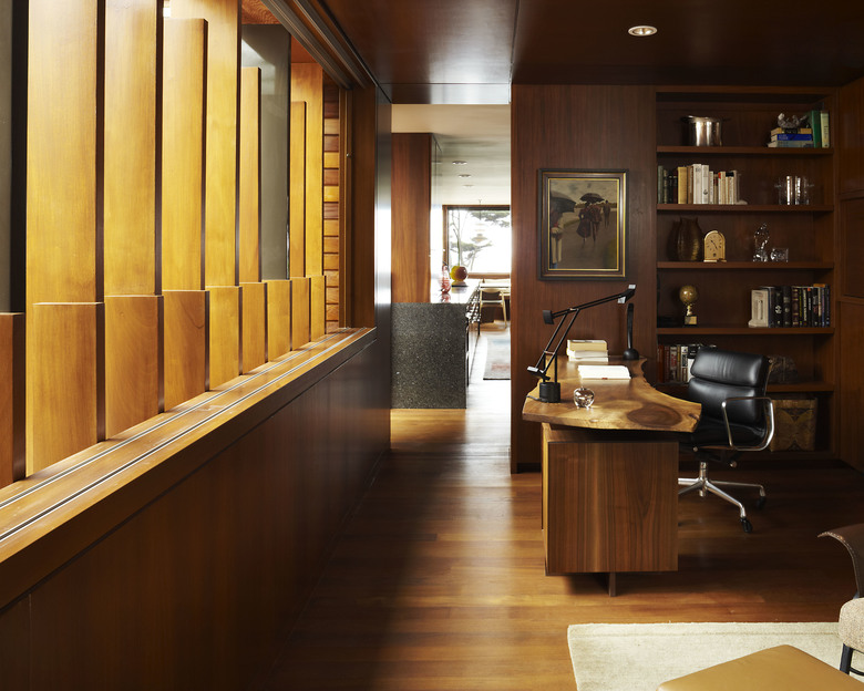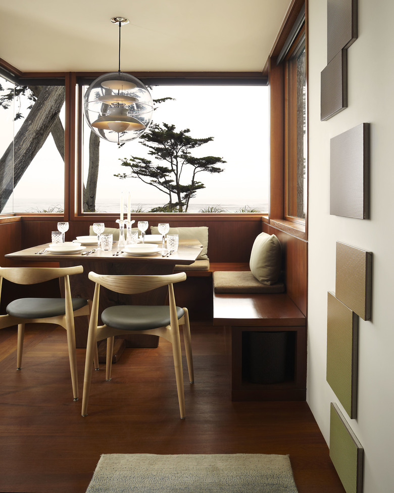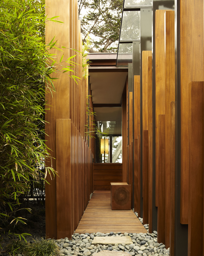 The house sits on a dense site facing Carmel Bay and the Pacific Ocean. The clients were keen to be fully cognizant of this amazing setting in all areas of the home. As such the house was conceived as a central room comprised of the courtyard, living room, and bedroom, bordered by niche spaces for the kitchen, breakfast nook, office and master bath. Fully folding doors/walls adjacent to the courtyard from the living room and bedroom literally open the full space up, and the rhythmic edge of vertical screen elements (solid mahogany and steel) create a loose border that stretches and compresses along its lengths.