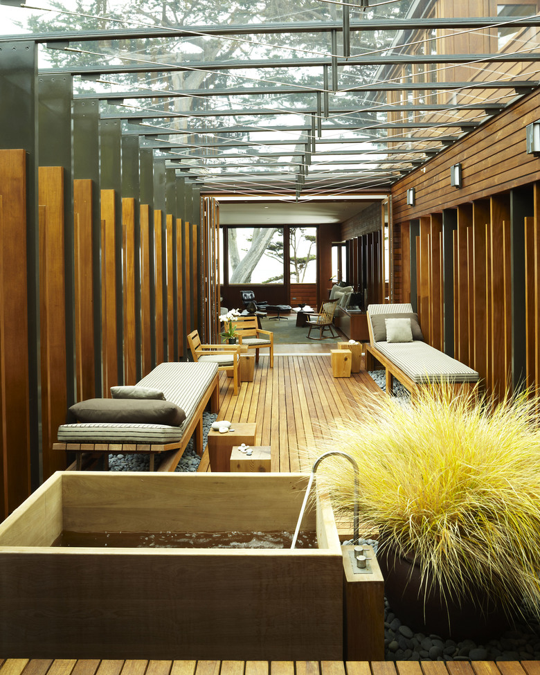 This central heart of the house is protected from strong seawater winds of the ocean by a glass roof, designed to allow for clear views upward and to maintain a warm center space. The steel columns that anchor the steel cable and strut trusses are integrated into the vertical wood screen – matching the changing rhythm and yet independently identified by a deep charcoal color. When a sweeping breeze is needed, the large sliding windows between the office and the courtyard are easily opened to allow full cross-ventilation. The house lives and breathes through the courtyard, and our clients live fully in this “large” room, even soaking in the Japanese Ofuro installed beneath the glass roof to watch the evening sky.