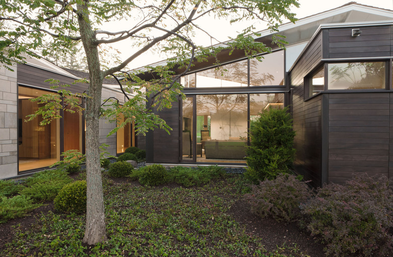 Located on a rolling and expansive site in Northern Illinois, the residence is designed as a collection of single storey pavilions systematically distributed into the landscape. When entering the site, a low wall clad in stone emerges from the landscape as an introduction to the architecture of the main building. The programmatic pavilions are collected under an undulating roof plane, visually connecting the activity of the natural landscape to the dynamic composition of the new residence.