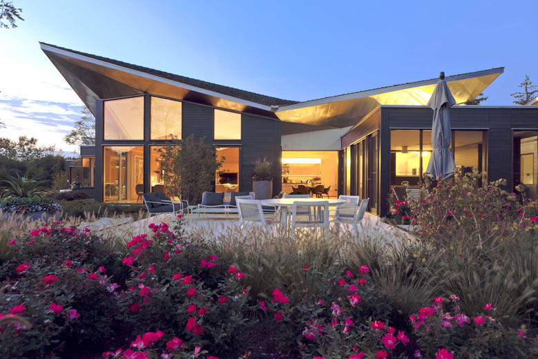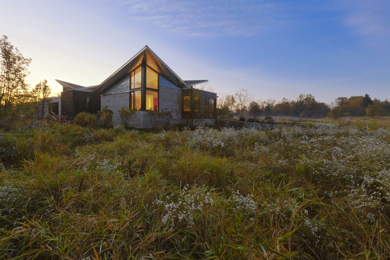 The main entry is located between the Bedroom Suite to the north and the Living & Dining Room volumes to the south. The Entry and Service Hall interiors are designed with consistent ceiling planes at a modest height. Upon entering the Living Room, Dining Room & Master Bedroom Suite the ceiling heights expand into an elegant faceted surface, opening expansive views of the surrounding prairie landscape.