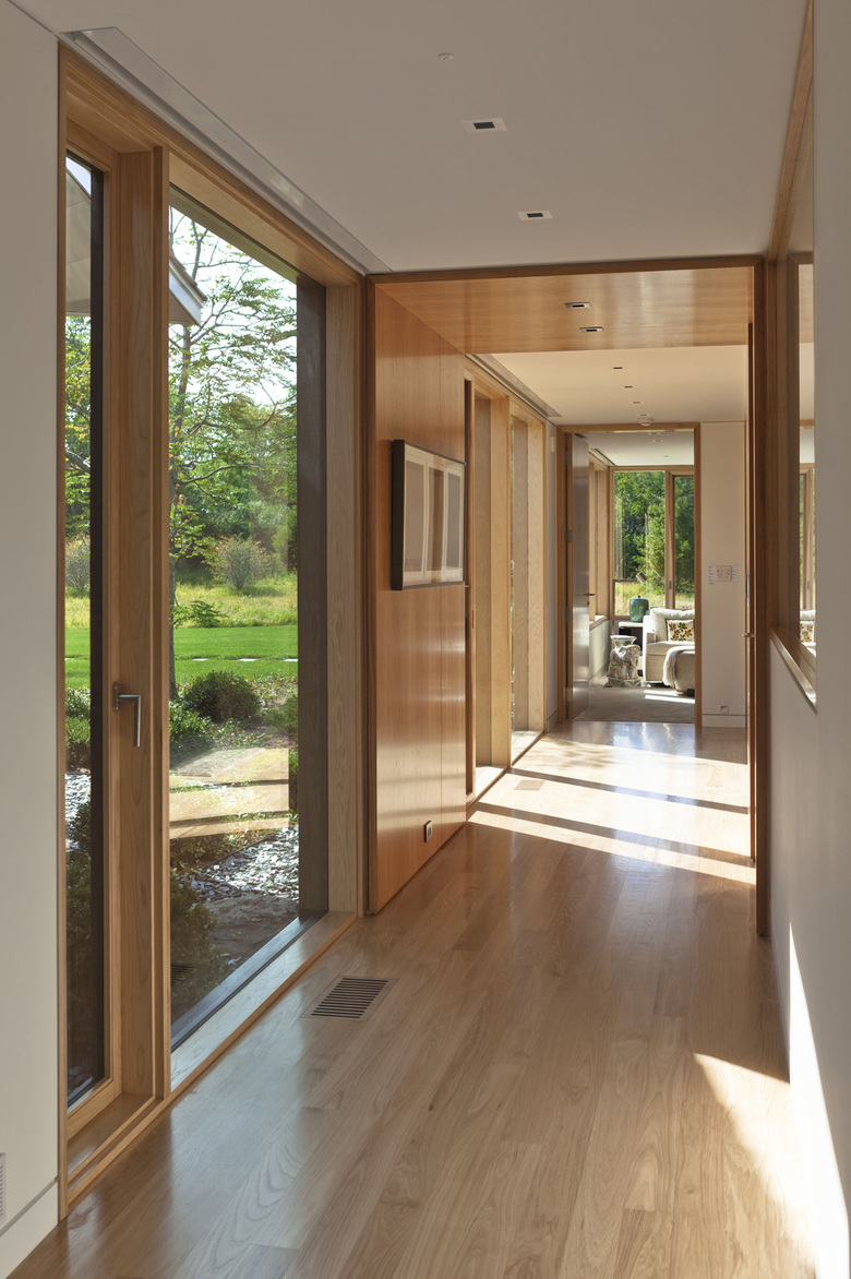 The exterior material palette is composed of a simple combination of stone, wood and glass intended to complement the trees, flowers and grasses typical of the local prairie landscape. The interior finishes (hickory, plaster, and a variety of stones) were selected for their subtle colors and textures, allowing the undulating ceiling plane to stand out as the residence’s predominant architectural feature.