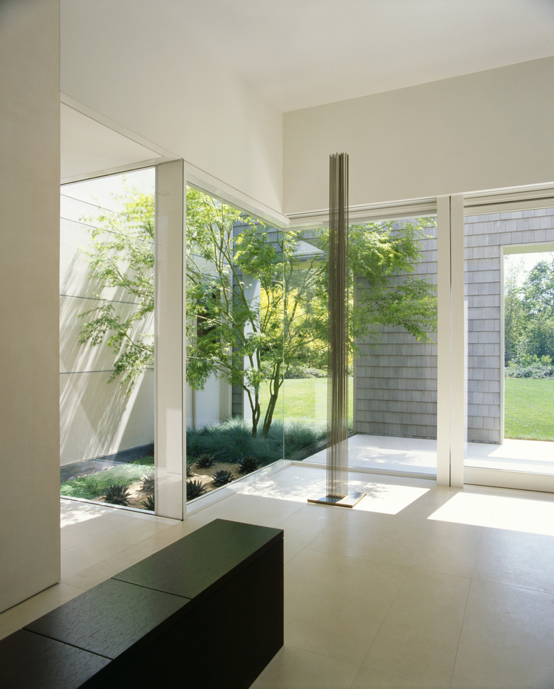The grid also enables the architect to explore how natural light enters the structure. The ceilings have been fractured and folded, revealing skylights above the ceiling plan and creating opportunity to explore the interplay between light and architecture. The limestone fireplace, which itself has been folded along the pattern, is illuminated by an adjacent skylight at the ceiling plane. Three circulation spines, made of glass and steel to delineate their distinction function, knit these spaces together and provide uninterrupted views through different sections of the house. These spatial volumes are then bound together by an enclosing perimeter wall, which creates a single form out of a village of buildings and landscapes. The irregular pattern of opening is this simple wall hints at the home’s underlying geometry and expresses the various function contained within. Simultaneously, the perimeter wall’s materials (cedar shingles) and rectilinear form help maintain a dialogue