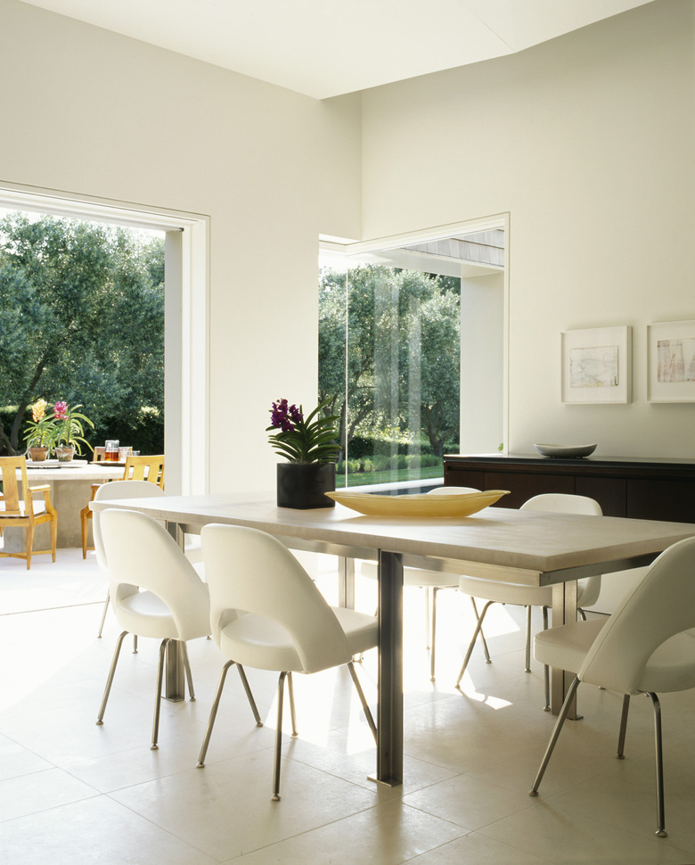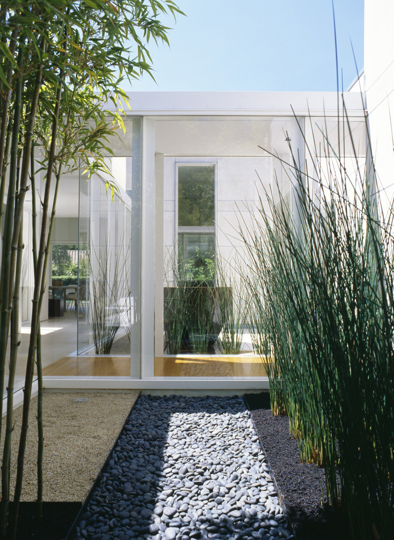 Accessibility, program, climate: all were important factors for a family of four who required a single story home and guesthouse on a one-and-a-half-acre site in Northern California. A stand of mature redwoods sits on one side of the property and a mountain range is visible to the southwest, meaning the site does not have a primary external view. The architect’s response to these conditions was to capitalize on the potential for a internalized landscape while exploring the dichotomy between the simple and the complex.