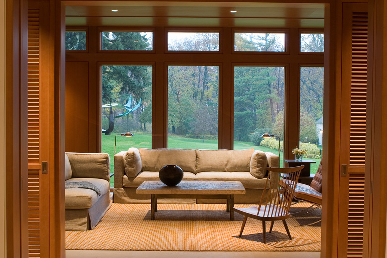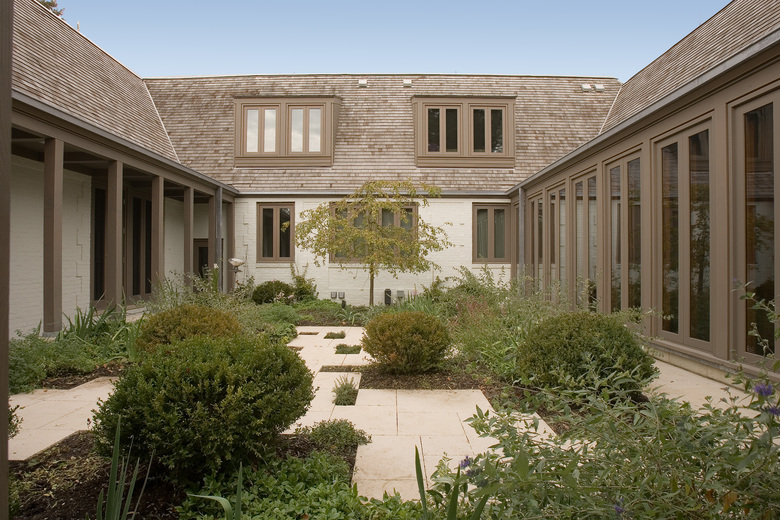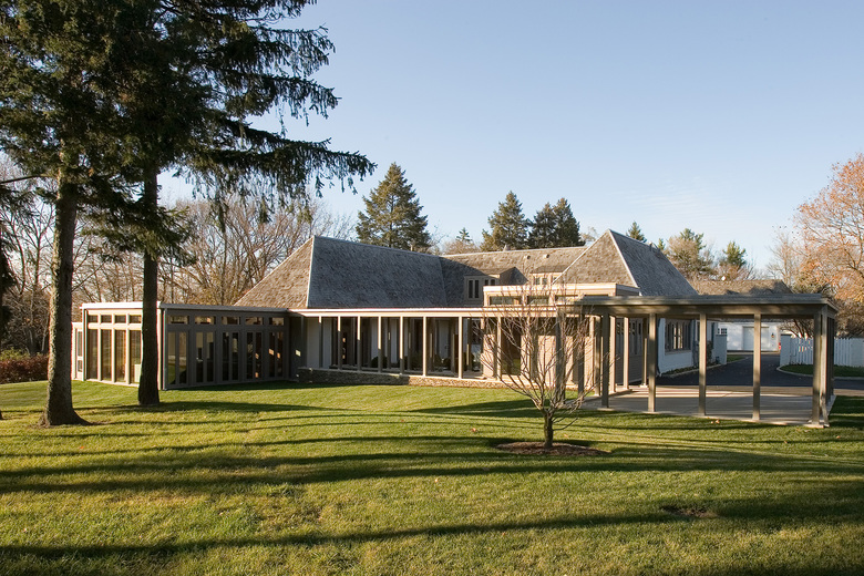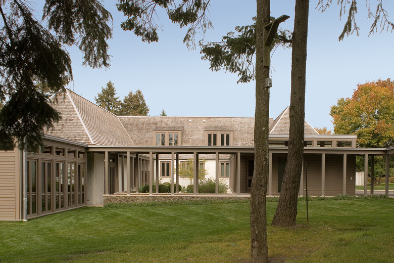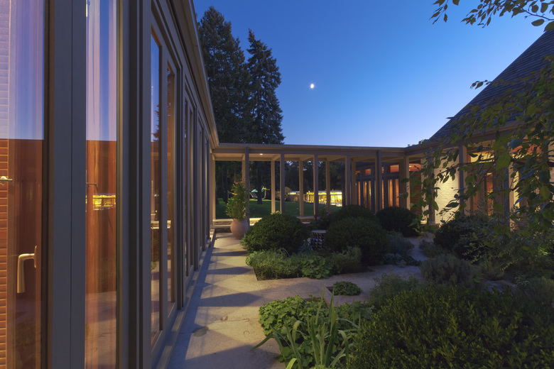 At the back of the house, a new structure extends beyond the main volumes of the house into the courtyard and surrounding landscape. Open in varying degrees to the outdoors, this structure provides alternate possibilities for circulation and encourages the use of both indoor and outdoor spaces.