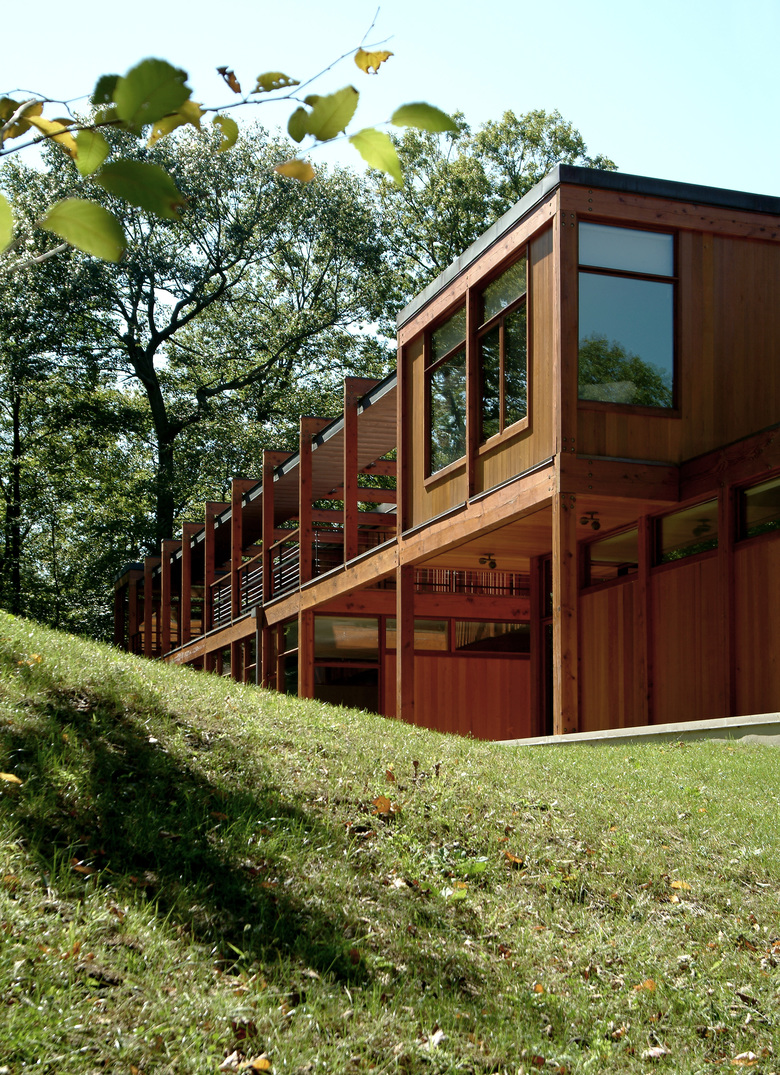 Located on a densely wooded site overlooking a spring-fed lake, this residence for a young family of five connects with the surrounding landscape while referencing their emotional proximity to New York City. The house is idealized as two horizontal lines spanning between natural outcroppings, and the sliding alignment of the wood bar over a band of dry-laid stone expresses a degree of motion. This occurs in plan as the thinness of the linear geometry allows for unobstructed transverse views through the main rooms of the house. The cross-axial orientation allows the interior spaces views to the east of the forest and the morning light and toward the west, views of the lake and the setting sun.