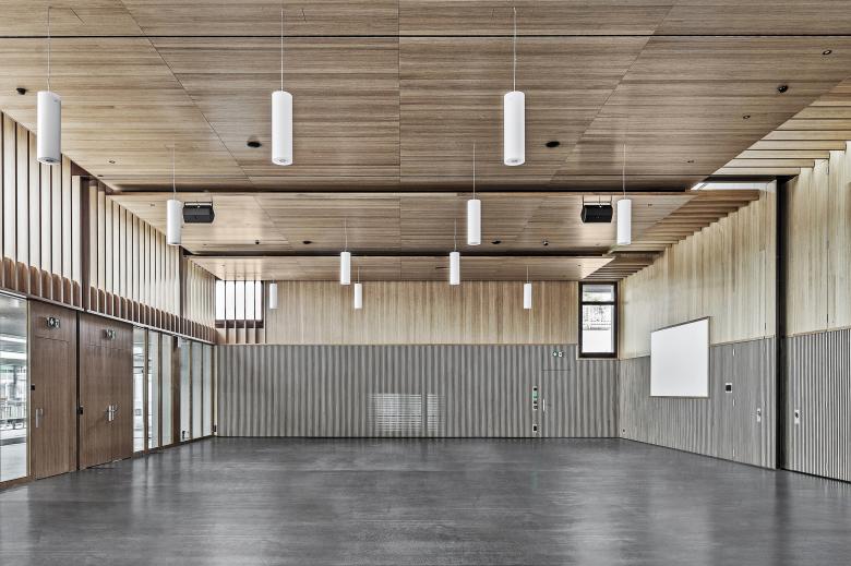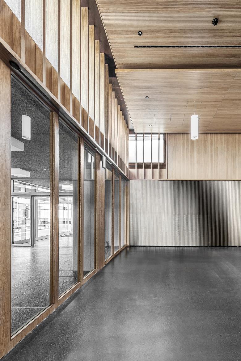 Der Campus der Interkantonalen Polizeischule Hitzkirch gehört zum Inventar der schützenswerten Ortsbilder der Schweiz. Im Aula Gebäude sollen neue Schulungsräume, Empfang, sowie Büroräume untergebracht werden. Aus Achtung vor dem grossen Ganzen erscheint es als richtig, den Charakter der Aula zu wahren. Die heutige Aula wird charakterisiert durch die Innenraumgestaltung mit Holz – dies wird so übernommen. Auch die Qualitäten der gestuften Decke und Wände werden beibehalten. Neu kann der grosse Saal einfach mit Schiebewänden in bis zu drei Seminarräume unterteilt werden. Der Empfang befindet sich künftig prominent am Anfang der Anlage.