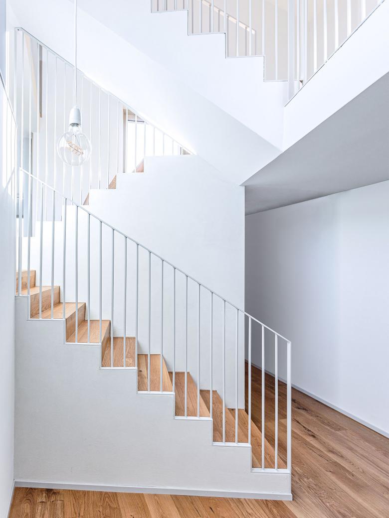 Der Baukörper orientiert sich an den umliegenden Gebäuden aus der Jahrhundertwende und richtet sich parallel zur anliegenden Strasse aus. Die zwei zusammengeschobenen Volumina spannen mit den Nachbarbauten einen vom Strassenlärm abgeschirmten, hofartigen Freiraum auf. Die Dachform, zwei ineinander verschnittene Satteldächer, reagiert auf den Sonnenverlauf.