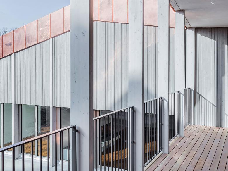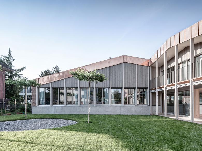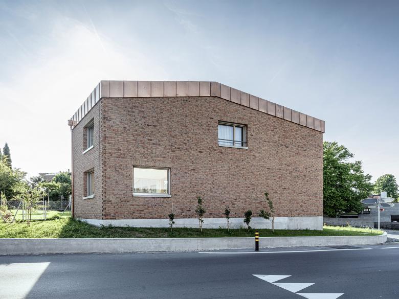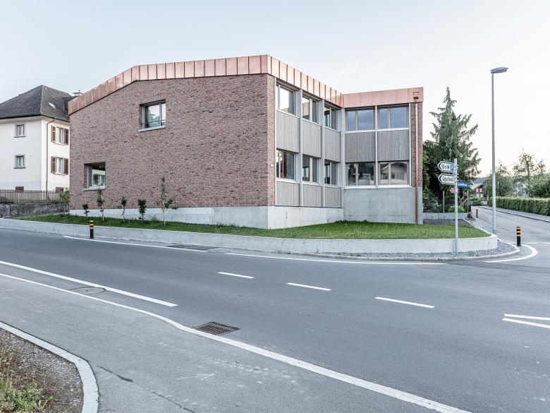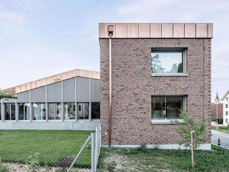 Gegenüber den beiden Strassen verhalten sich die Fassaden geschlossen. Zum Hof und Dorf hin prägt eine leichte Holzkonstruktion das Fassadenbild. Der dreiteilige Baukörper wird mit einem Betonsockel, einem Hauptkörper mit Klinkerfassade und Kupferdachrand gegliedert. Die beiden Baukörper sind halbgeschossig versetzt und nehmen den leichten Hangverlauf auf.