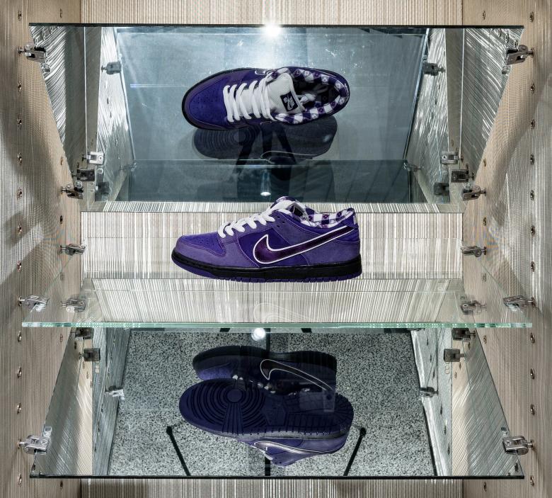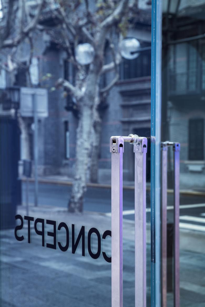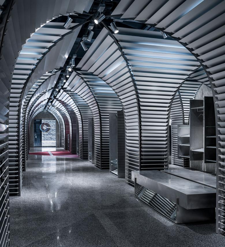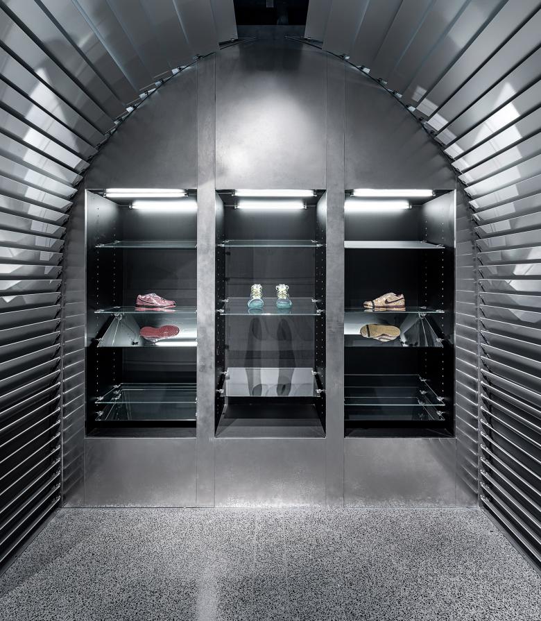 In this project, the store needs to reconcile two different operational needs -- daily retail sales and releases of limited-edition sneakers. dongqi Architects divides the original space into two spaces with distinguishable vibes. The front space along the main path is in keeping with the original Shikumen style of buildings in old Shanghai. Its delightful and cozy ambiance makes it a suitable reception room for product shows or events. The back space for retail sales is deliberately blocked from the main path to create a sense of mystery. Unlike the front space, the back space is built with anodic aluminum oxide, stainless steel, metal textiles, carbon fiber and terrazzo etc.