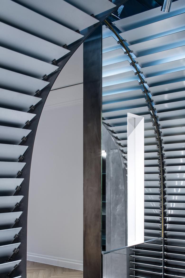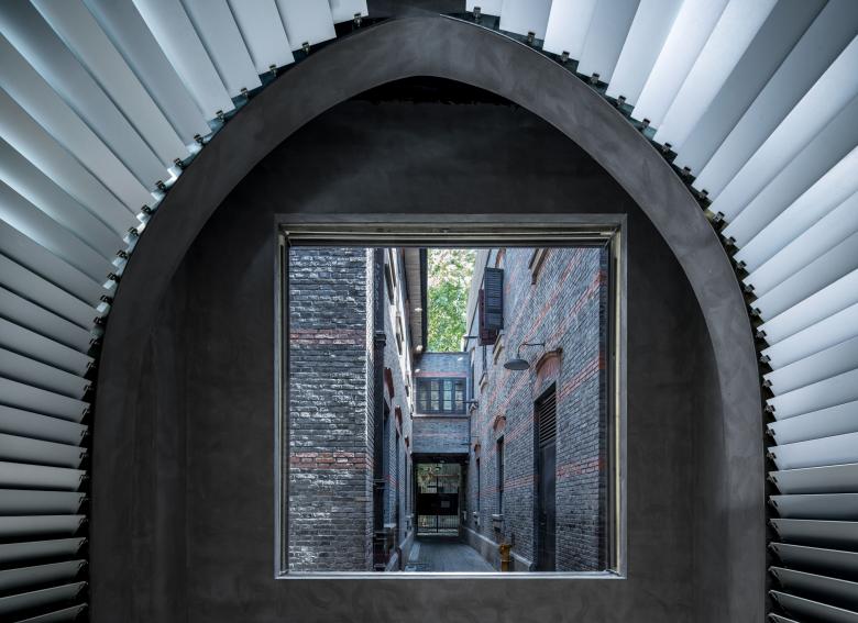 Elements of the umbrella-shaped system can also be found at the door and windows of the building façade, in which stainless-steel materials have been rotated vertically to 90 degrees and embellished into the old Shikumen-style grey bricks. They are the first clue that the room inside has something new and special to offer.
