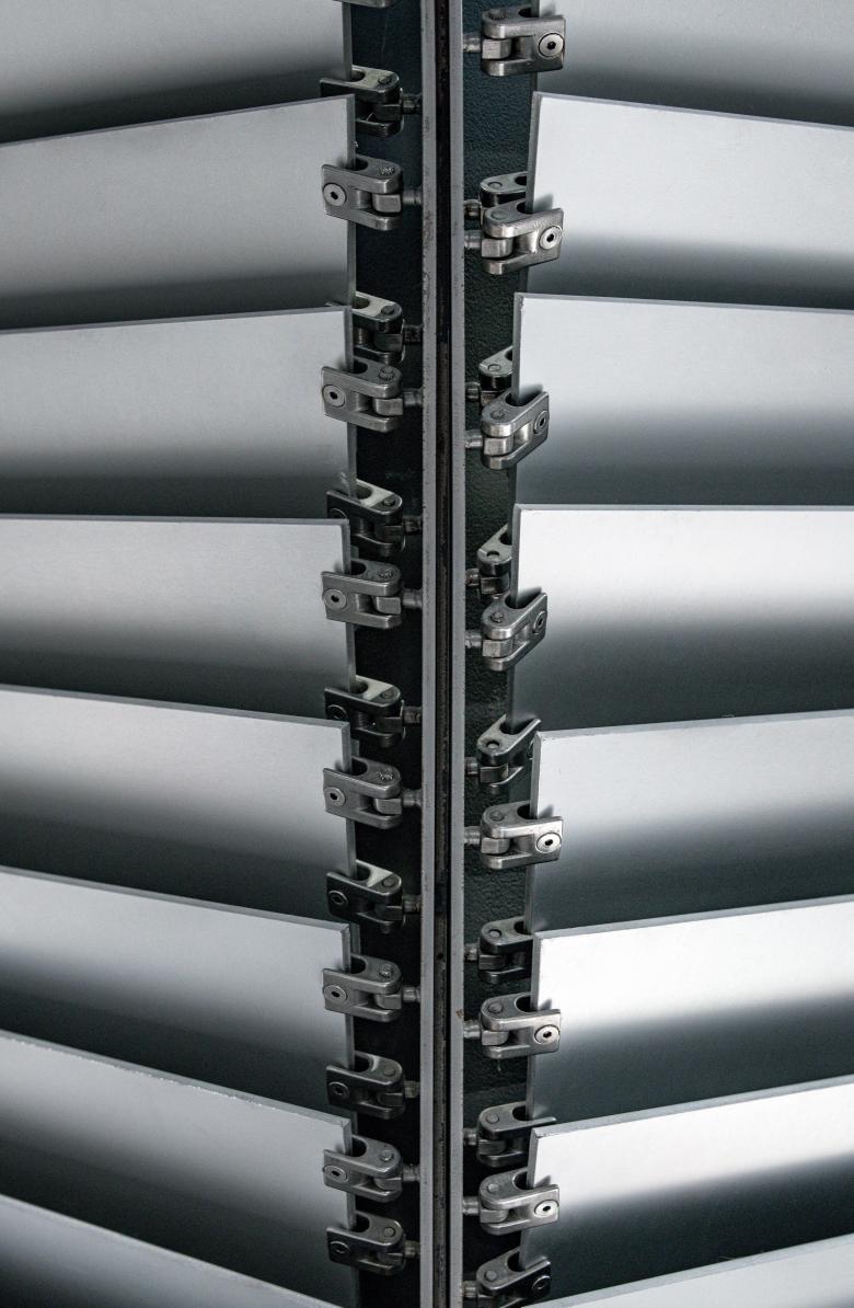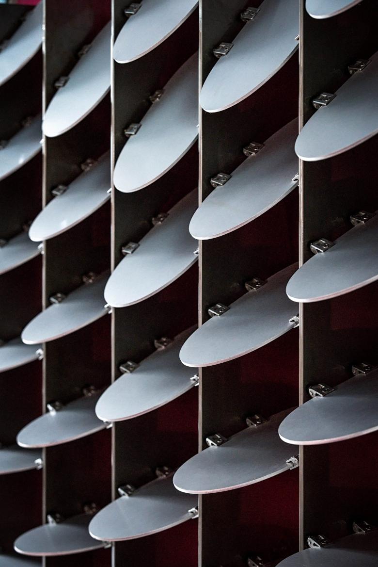 In the umbrella-shaped system, shutters are open or closed to certain degrees based on a designed algorithm. The slats of shutters, which are made of anodic alumina, are able to change angles at different heights to meet the operational needs while maintaining aesthetics. For example, the MEP air conditioning and the lighting system are hidden at the higher place of the columns and the power system are hidden at the lower place. Lights, closed-circuit television, audio sound system, and fire safety equipment are carefully placed between columns.