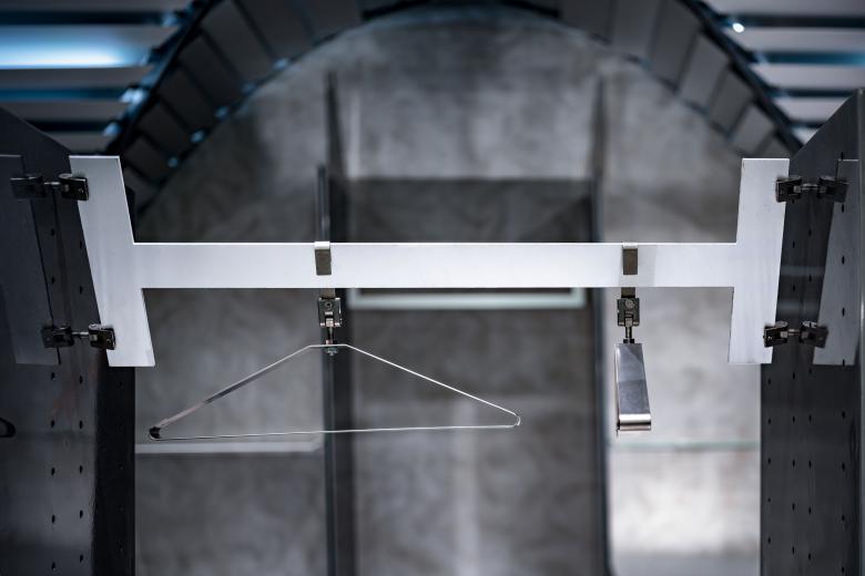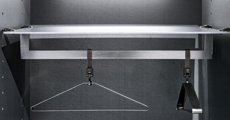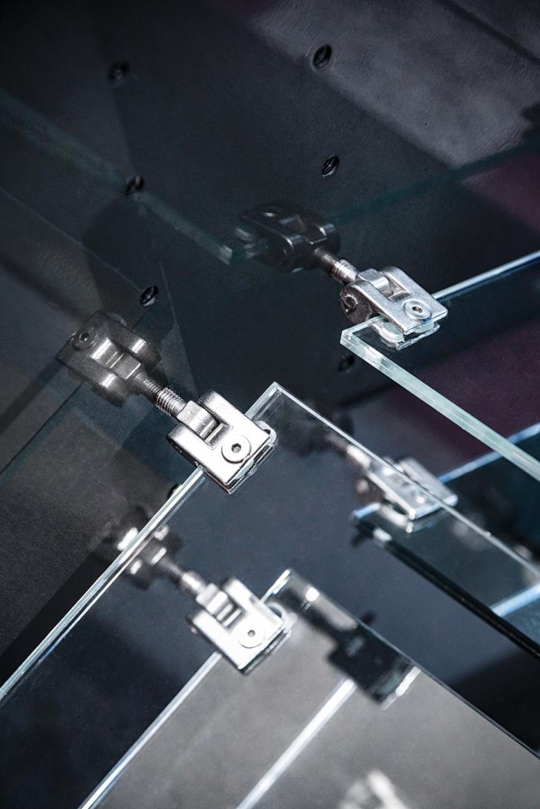 Anodic alumina slats of different shapes are fixed to each position by stainless-steel joints specially designed, prototyped and produced for CONCEPTS. Each of the specially created joints enables 3-axis rotation so as to fix materials firmly to a position and fulfil customized functions. The joints are also used to make the adjustable display racks, walls of the fitting room, doorknobs and hangers that can suit different angles.