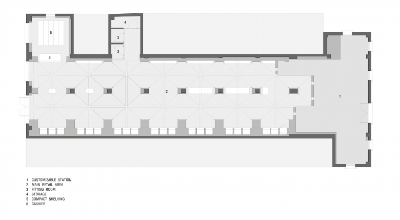 The original building had a row of columns at the center that might negatively affect retailing. After careful consideration, dongqi Architects decided to strengthen the presence of the columns to give an impression of orderliness. They designed and added two more rows of columns to form an umbrella-shaped system, which successfully reinforced the order of space. Under the umbrella-shaped system, there are relatively independent and quiet showrooms for merchandising displays. This way of display gives out a sense of solemnness and makes shopping a special experience. Moreover, it enables the access aisle to look clean and pure and brings a sense of drama to the room.