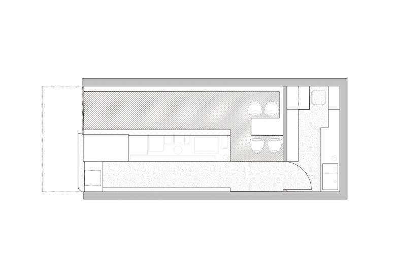 The façade is also made with same laser-cut steel sheet. The proportion¬ of the steel sheet is carefully designed to have a dialogue with the semi-cylinders inside. Meanwhile, throughout the cutouts we could see some subtle green parts and it create a contrast with the interior. A big-folding door is used to open up the indoor space as much as possible to connect the street with the indoor space. Next to the door, the pick-up window is wide and flipped up to give customers a visual and aromatic experience while the skilled staff is preparing juice for the customers.