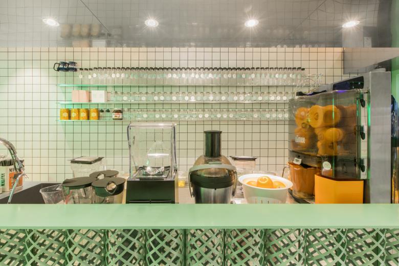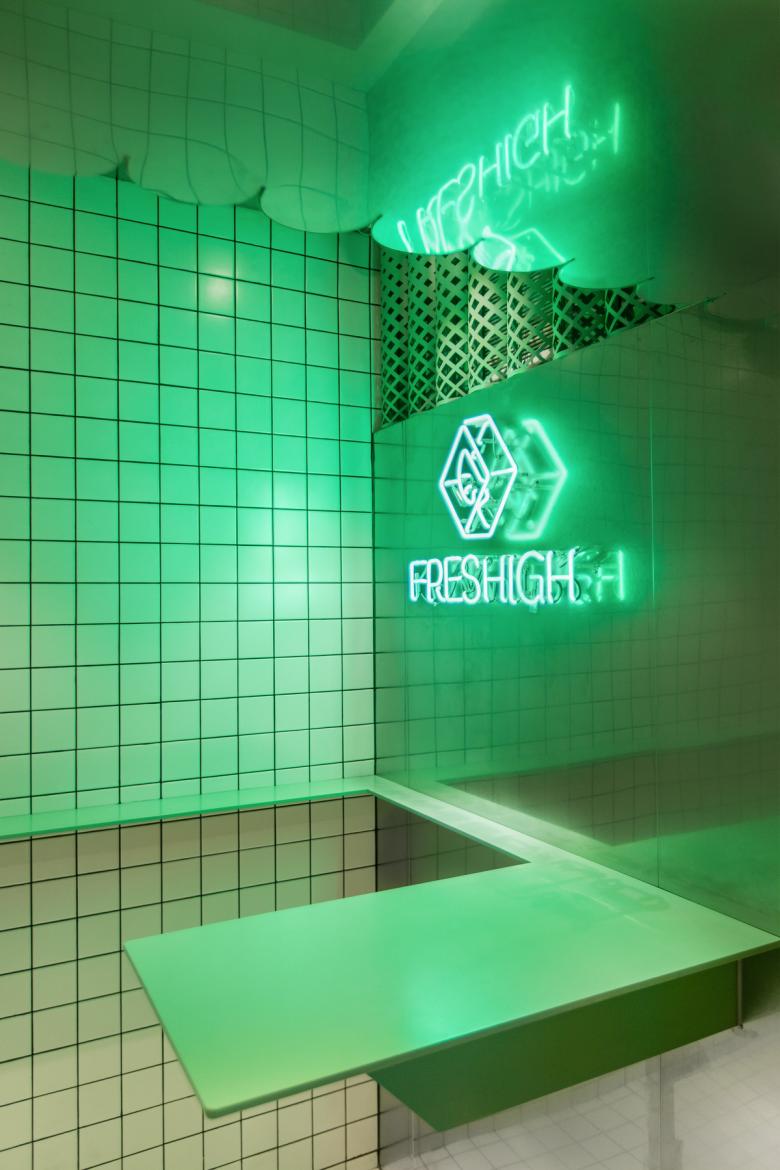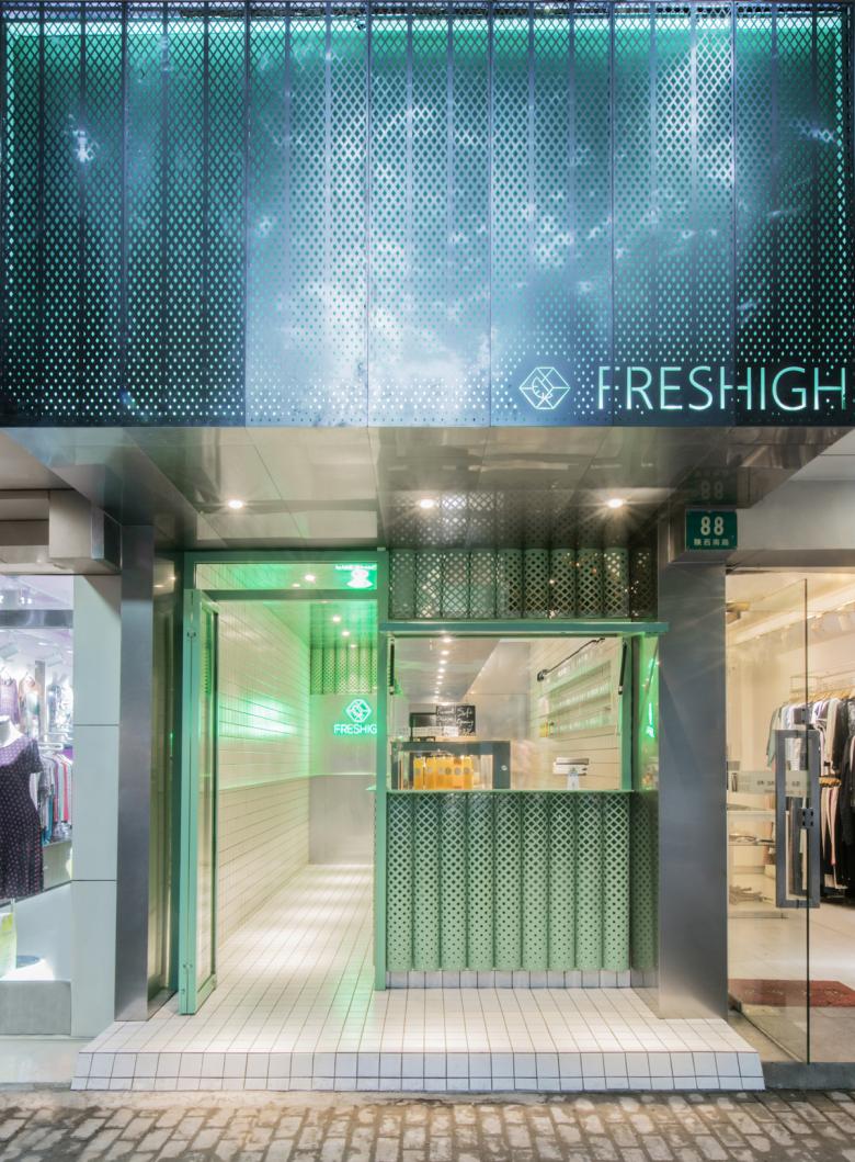 The FRESHIGH designed by dongqi Architects is located on South Shaanxi road, in the center of Shanghai. The primary task in this project is to renovate the retail store into an appealing space to attract more customers and let it merge into the surroundings. At the end, it was turned into a refreshing space with soft green color filled all around. Hiding in the historic neighborhood, the designer hopes that it could give a surprise to the people passing by. They could stop and relax for a cup of fresh juice, and then go back to daily life.