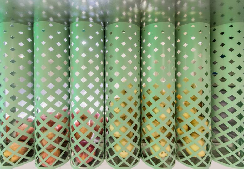 Functionally, these semi-cylinders act like covers of the ventilator and the fan of the air conditioner. At the same time, they are great containers for fruit. The cutouts ensure the air circulation for fruit to make sure they are fresh. Furthermore, these containers are hanged above the bar and could let the customers have a better sense of raw material visually.