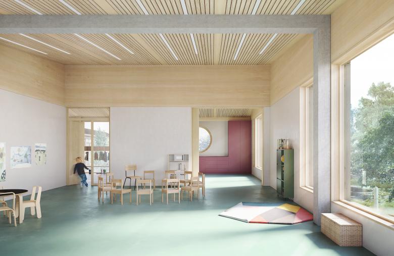 Visualisierungen Wettbewerb Neubau Kindergarten und Sanierung Schulhaus Boge