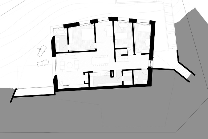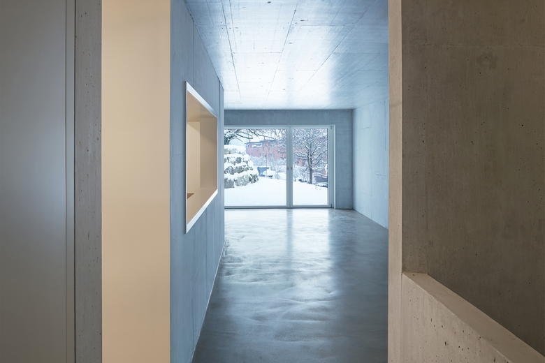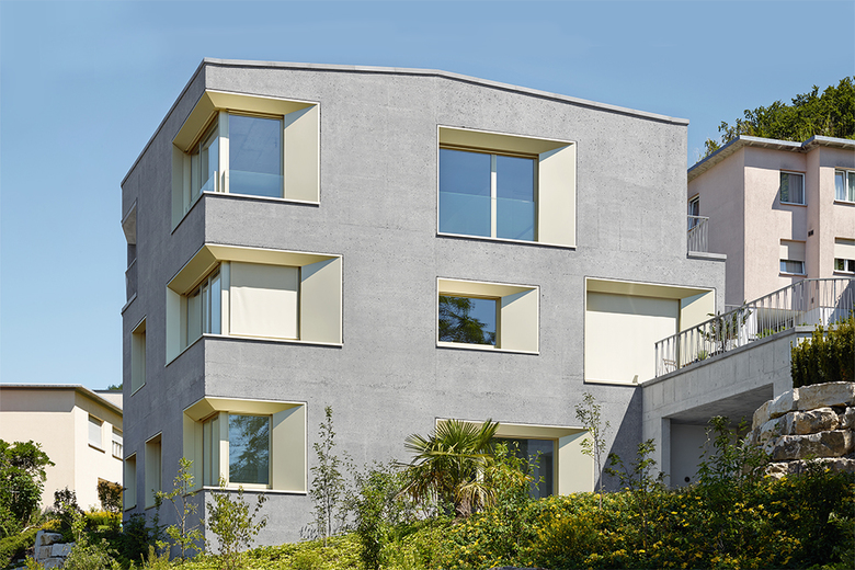 Für ein Mehrfamilienhaus in Baden entwerfen wir innerhalb einer schmalen, dreieckigen Parzelle am Hang einen kubischen Solitär, der dem gebauten Kontext trotzt und sich im Hang verankert. Es gibt kein Treppenhaus, vielmehr sind drei Wohnungen derart gestapelt, dass sie jeweils einen eigenständigen Zugang erhalten. Jede Wohnung basiert auf einer kreuzförmigen Grundstruktur, diese wird jedoch individuell interpretiert: Im Erdgeschoss entsteht eine Familienwohnung mit grosser Wohnküche, Terrasse und Garten. Darüber befindet sich eine Loftwohnung mit herrlichem Ausblick in das Limmattal, und die Dachwohnung basiert auf einem Raum-zu-Raum-Prinzip mit privatem, innen liegendem Patio.