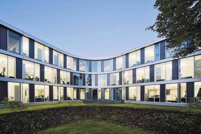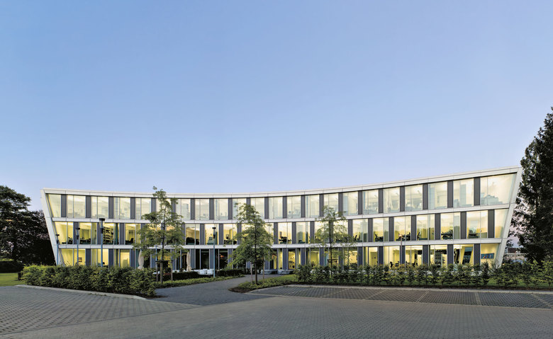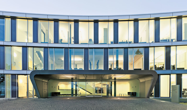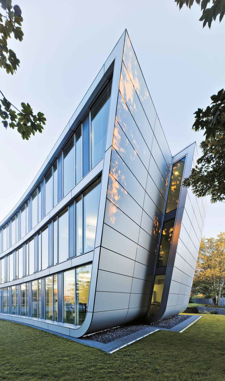 Zu den konkaven Langseiten – 2 mit schwächerer, eine mit stärkerer Krümmung – treten die 3 Schmalseiten mit ihren je doppelt schrägen, das heißt aus der Waagrechten wie Senkrechten kippenden, dann noch geteilten und versetzten Wandstücken in lebhaften Widerspruch. Rundum mit Paneelen aus Aluminium verkleidet, wird das 3 Geschosse hohe Gebäude durch einen breiten Eingangsbereich mit Vordach von Südosten erschlossen.