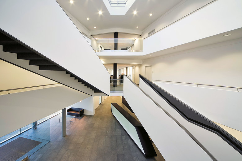 Hinter dem Windfang breitet das Foyer sich aus; hier findet sich auch ein Café und Bistro. Am meisten jedoch fallen die beiden Treppen vom Erdgeschoss in das Erste und vom Ersten in das Zweite Obergeschoss ins Auge. Was diese Anlage so besonders macht, ist weniger die Figur des großen V, als vielmehr die Art, wie sie mit den formalen Kontrasten einerseits von Schwarz und Weiß, anderseits von Positiv und Negativ operiert.