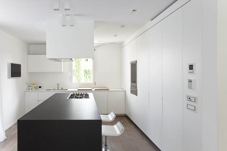 The fixed furniture becomes part of the structure of the house, defining simple geometries and pure volumes through the use of few materials such as wood, plaster and stone.
