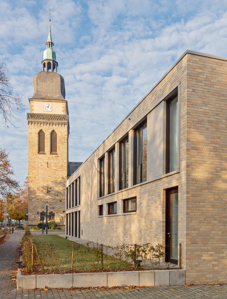 Der Neubau bildet mit der angrenzenden Pfarrkirche St. Amandus ein neues Ensemble und stellt durch vielschichtige Blickbeziehungen einen Bezug zu seiner Umgebung her, ohne die städtebauliche Dominanz des Sakralbaus zu beeinträchtigen. Das Bauwerk als Komposition aus zueinander verschobenen längsrechteckigen Baukörpern greift im Osten den Straßenverlauf der Heibeckstraße auf und definiert gleichzeitig einen Vorplatz für das Pfarrheim. Nach Westen zur Kirche formt sich ein Gemeindeplatz, der ausreichend Raum für kirchliche Feste bietet.