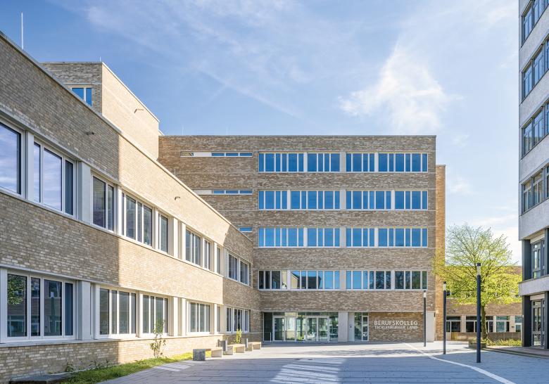 Das Berufskolleg Tecklenburger Land bildet mit seiner zentralen Lage vis-à-vis zum Bahnhof und seiner Geschossigkeit einen wichtigen städtebaulichen Schwerpunkt in Ibbenbüren. Das Schulgebäude, bestehend aus zwei Bauteilen aus 1958 und 1976, wurde bei laufendem Schulbetrieb in vier Bauabschnitten saniert, modernisiert, energetisch ertüchtigt und restrukturiert. Der Wert des Bestands und dessen Graue Energie wurden weitergenutzt, vorhandene Potenziale freigesetzt und Raum für eine zukunftsfähige Pädagogik geschaffen. Das Berufskolleg wurde von einer dunklen, unflexiblen Flurschule ohne Gemeinschaftsflächen, funktionale Zusammenhänge und Aufenthaltsqualität zu einem identitätsstiftenden Lern- und Lebensort qualifiziert. Die Nutzer wurden durch regelmäßige Abstimmungen aktiv in den Planungsprozess mit einbezogen.