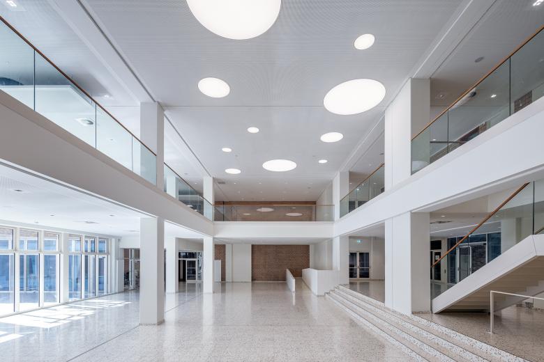 Die heutige Architektur bildet den baulichen Rahmen für die Umsetzung des pädagogischen Konzepts der Schule und offeriert vielfältige Nutzungsmöglichkeiten. Im Bestand wurden im gesamten Schulkomplex Lerninseln und Aufenthaltsbereiche geschaffen, die Raum für eigenverantwortliches Lernen, Gruppenarbeit, individuelle Förderung und Rückzug bieten. Forum, Bistro und Selbstlernzentrum werden multifunktional im Tagesverlauf von schulischen und außerschulischen Akteur*innen genutzt. Offene Lern- und Erschließungszonen, tageslichtversorgt durch große Fensteröffnungen, Lichthöfe und Oberlichter, sowie Transparenzen zwischen Räumen und Ebenen bilden Sichtbeziehungen. Das Material- und Farbkonzept schafft Identität und Orientierung und trägt wesentlich zur angenehmen Lern- und Lebensatmosphäre bei.