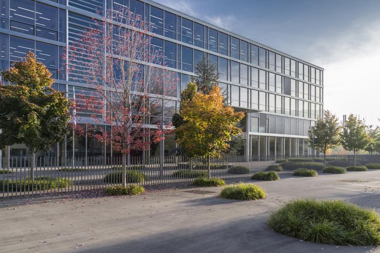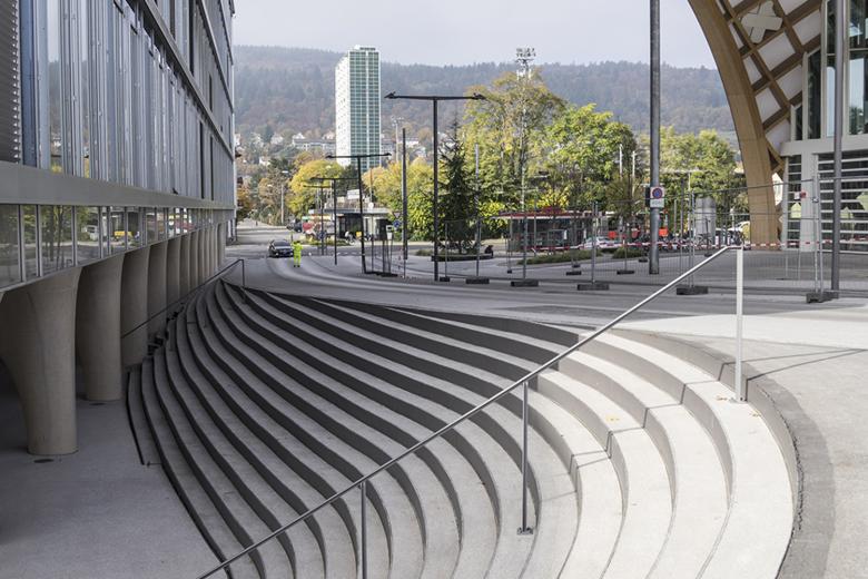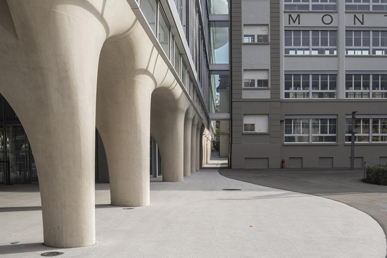 Wer den Swatch/Omega-Campus betritt, bewegt sich durch eine Baumhalle. Die Bewegung lässt die Säulen der Stämme oszillieren. Vordergrund und Hintergrund scheinen in verschiedenen Geschwindigkeiten vorbeizuziehen. Die Logik eines Rasters ist spürbar, doch nicht ganz greifbar, setzen sich doch einzelne Bäume aus dem alten Bestand über das Raster hinweg. Innerhalb des Rasters sind Wechsel der Atmosphäre, Verdichtungen, Aufweitungen, zu entdecken. Über die Baumkronen hinaus ragen weithin sichtbar die mächtigen Gebäude.