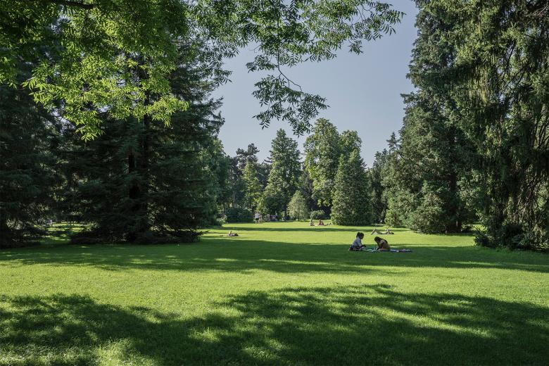 Die historischen Wegachsen und der Baumbestand bilden bis heute die Grundstruktur des Parks. Neu dagegen sind die Räume, ihre Bezüge und Inhalte: Das Leitbild von Fontana Landschaftsarchitektur schälte hierfür Themen mit Potenzial aus dem Sammelsurium der Elemente aus verschiedenen Zeiten heraus. Es reduzierte, sanierte, schuf neue Perspektiven, neue Tiefe, fand Antworten auf den wachsenden Nutzungsdruck.