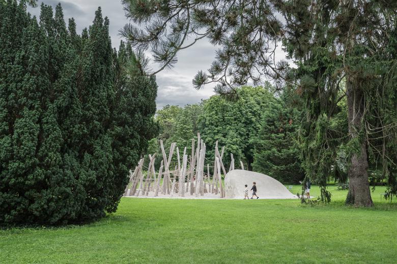 Entlang der westlichen Erschliessungsachse liegen neue Spielangebote zwischen den alten Koniferen in der offene Parkmitte: Fünf kreisrunde Spielinseln aus Beton bieten einen starken, formal einheitlichen, doch in der Nutzung flexiblen Wechselrahmen für ein breites Spektrum an Aktivitäten.
