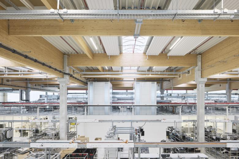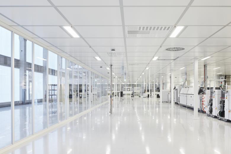 Im Produktionsgebäude sind die beiden Bereiche Fertigung und Logistik angesiedelt. Der Fertigungsbereich nimmt einerseits die Serienfertigung der Elektronik-Bauteile und Anlagen auf. Andererseits besteht der Logistikbereich aus Lagerhaltung der Einzelkomponenten sowie Verpackung und Versand der Endprodukte. Mit dem Bürobau ist die Fertigungshalle niveaugleich auf der ersten Ebene verbunden.