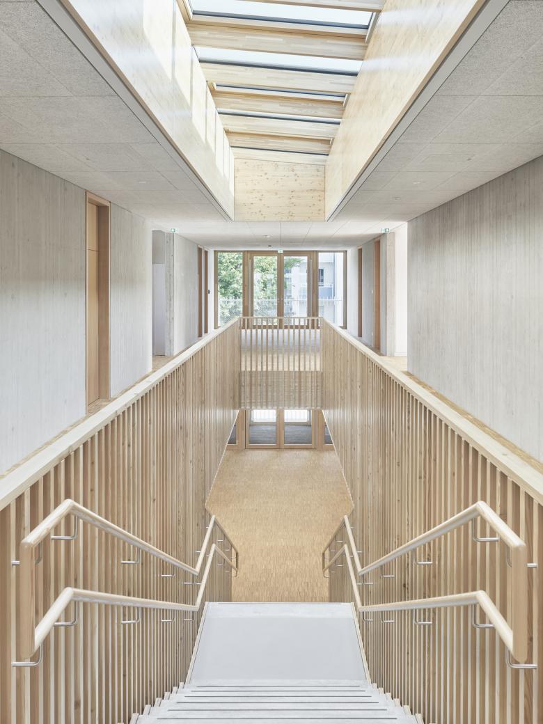 Energiekonzept – Die prägende kompakte Kubatur und ein energetischer Standard über den aktuellen Vorgaben bilden die Basis für einen energieeffizienten Betrieb. Die Gebäudedämmung ist mit Holzfaserplatten, die Massivbauteile sind in RC-Beton ausgeführt. Die Wärmeversorgung erfolgt über das im Aufbau befindliche Nahwärmenetz (BHKW). Ergänzt wird das Energiekonzept durch die vorgesehene großflächige Photovoltaikanlage auf dem dafür vorbereiteten Gründach.