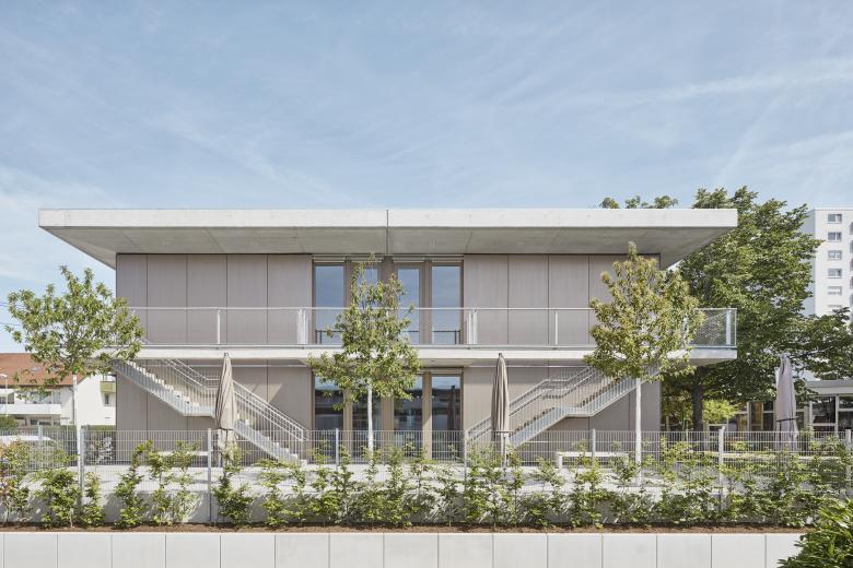 Gebäude – Die Außenerscheinung der zweigeschossigen KITA wird von der Einheitlichkeit der Fassadenbekleidung und Fenster in vorvergrautem Lärchenholz geprägt. Aufgrund des einheitlich durchgängigen Fassaden-Gestaltprinzips und Materialität der Baukörpergestaltung bewahrt sich das Gebäude eine Eigenständigkeit innerhalb der umgebenden Wohnbebauung. Die Materialität des Außenraums setzt sich beim Innenausbau und dem zentralen Spiel- und Erschließungsflur fort. Besonderes Augenmerk liegt auf dem Erhalt der Eigenwertigkeit der verwendeten Materialien: Unbehandelte Holzoberflächen und sichtbar belassene Betonbauteile bieten differenzierte haptische Qualitäten. Für sich wandelnde Konzepte in der künftigen Nutzung bildet das Materialkonzept einen robusten Rahmen.