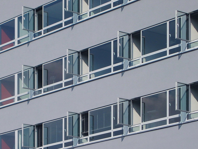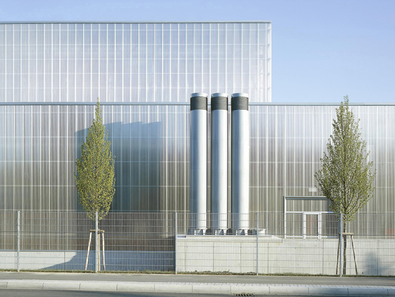 Gebäudetechnik – Ein hoher Stellenwert wurde auch dem energetischen Konzept eingeräumt, um das im Gewerbe- und Industriebau meist nicht genutzte Energieeinsparungspotential auszuschöpfen. Die sommerliche und winterliche Konditionierung der transluzenten Halle erfolgt über einen Erdkanal mit einer Gesamtlänge von rund einem halben Kilometer. Mittels der über den Jahresgang nahezu konstanten Erdreichtemperatur wird die angesaugte Außenluft im Winter erwärmt und im Sommer gekühlt. Ergänzt wird das energetische Konzept durch großzügig dimensionierte RWA-Öffnungen für Taglüftung und Nachtluftspülung und durch eine feststehende außenliegende Sonnenschutzstahlkonstruktion mit großflächigen „brise-soleil“ an den Südfassaden der Halle. Diese Sonnenschutzlamellen sind gleichzeitig die Vorrüstfläche für eine geplante Photovoltaikanlage mit 525 Quadratmetern. Das in Niedrig-Energie-Standard errichtete Bürogebäudes wurde zur effektiven Nutzung thermischer Speichermassen mit einer thermischen Bauteilaktivierung und einer Nachtluftspülung über motorisch betriebene Fensterklappflügel ausgestattet. Mit diesen Maßnahme konnten sowohl die Investitionskosten für Anlagentechnik, als auch die Betriebskosten und der CO2-Ausstoß in erheblichem Umfang gesenkt werden.