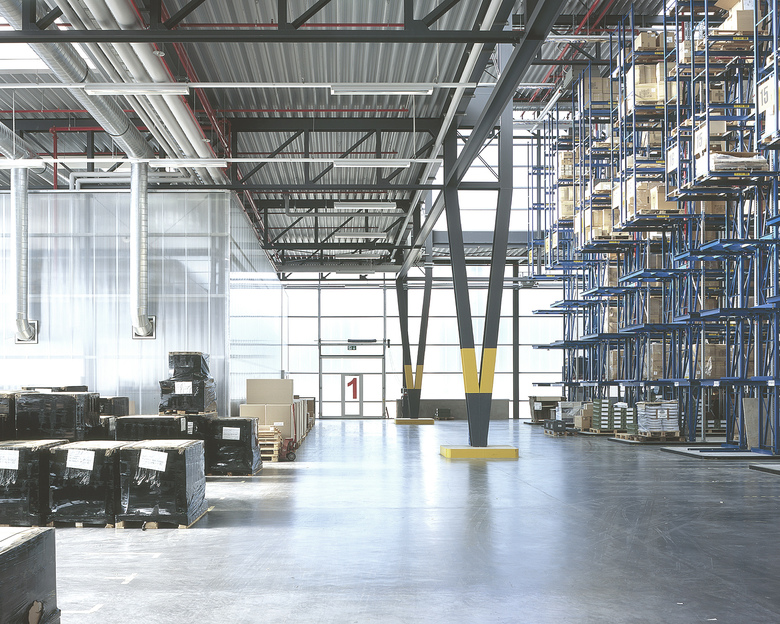 Konzept – Dem nutzungsbedingt sehr großen homogenen Gebäudevolumen begegnet das Entwurfskonzept eines „transluzenten Monoliths“ mit einer sich im Spiel der Lichtverhältnisse stetig wandelnden Hülle. Verschiedene Licht- und Wettersituationen erzeugen wohltuende visuelle Irritationen über die tatsächlichen Gebäudemaßstäbe. Mit diesen ungewohnten Seheindrücken behauptet sich das Gebäude im heterogenen Umfeld „Gewerbegebiet“ und erhält einen signifikanten Wiedererkennungswert. Kernstück der baulichen Umsetzung dieser Konzeption ist eine filigrane Stahlskelettkonstruktion über die sich eine „Haut“ aus nur vier Zentimeter starken standardisierten Polycarbonat-Steg-Platten spannt. Diese Hüllkonstruktion erzeugt eine für derartige Nutzungen außergewöhnlich helle und freundliche Arbeitsatmosphäre im Innern. Außerdem teilen sich die Arbeitsabläufe schemenhaft nach außen mit. Aufgrund der ebenfalls transluzent ausgeführten Fassadenflächen des eingerückten Hochregalbereiches fällt auch in die Hallenmitte reichlich Tageslicht ein. Es stehen knapp 10.000 Quadratmetern Hallengrundfläche rund 5.500 Quadratmeter lichtdurchlässige Hülle gegenüber. Das sich westlich anschließende Bürogebäude bildet als „massiver Monolith“ einen Gegenpol zur kristallin erscheinenden Halle.