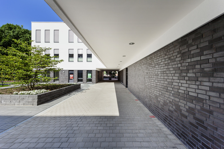 mehr sichtbar ist. Um der kleinteiligen Bebauung der Bahnhofstraße Ruhe zu verleihen, wurde die Fassade hier nur mit Verblendmauerwerk versehen. Durch die großzügigen Verglasungen im Erdgeschoss erhält die Fassade dennoch eine sichtbare Leichtigkeit, die durch den Zugang zur Passage in der Mitte betont wird.